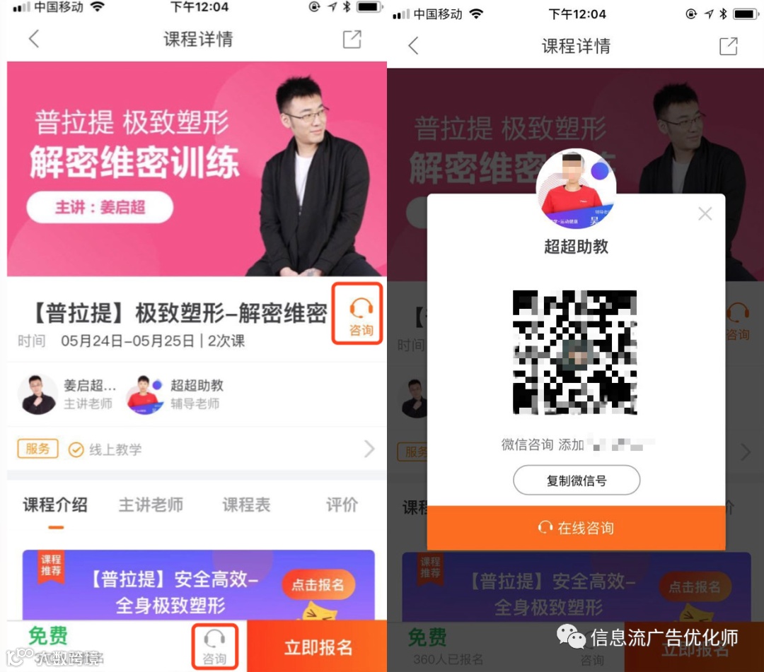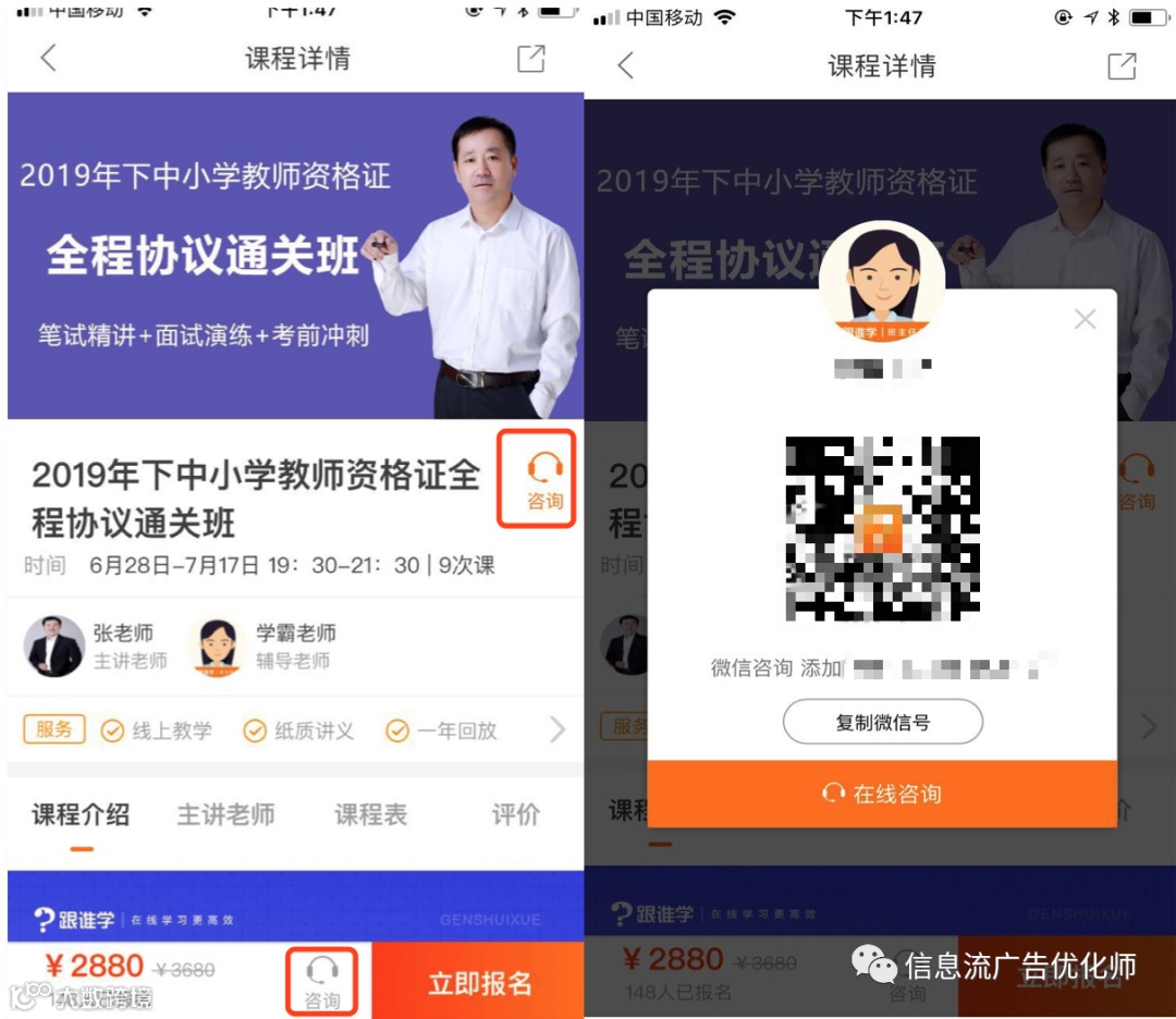 在报名页面的醒目位置,有两个“咨询按钮”,全是引导添加本堂课辅导员微信。在成功报名后,依旧会有短信push,继续引导添加本堂辅导员。即使没有看到短信,进入课堂学习的时候课程详情页会继续强引导。