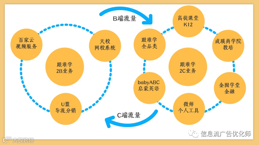 从上图看的出,跟谁学左手课程,右手平台。相比左手课程产品,“跟谁学”的右手更厉害:做平台产品,而且同时向B端和C端发力。于是乎,“跟谁学”更大的野心显露无疑,他想从教育平台走向教育生态。