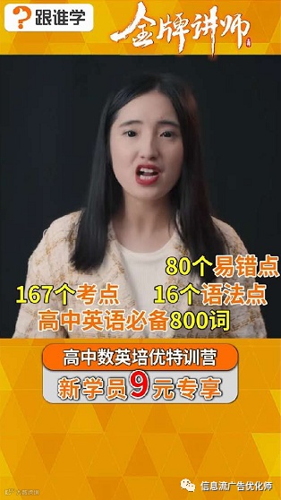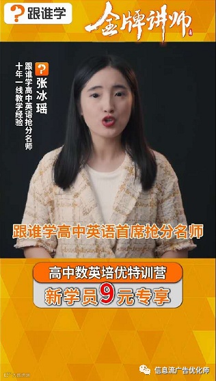 如上这条广告中,以高中英语的困惑为开头,通过名师指出很多人的知识盲区。解决疑惑,有实用性的问题提起用户的兴趣,通过新概念性把跟谁学的广告植入末端。【篇幅关系,请自行百度或头条查询相关视频】