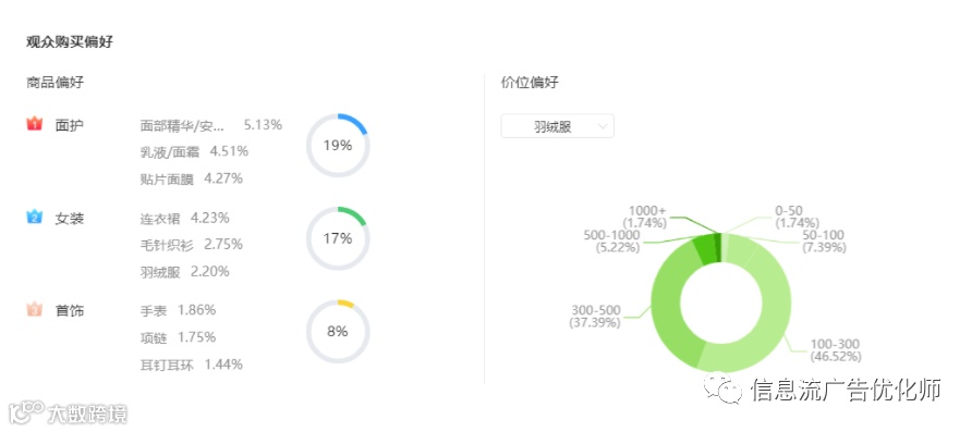 比如我们看到这场主推日用百货类的直播间,观众还喜欢在其它直播间购买面护、女装即首饰类商品,同时结合观众的年龄分布,就可以进行精准投放,同时,观众购买偏好还可以为直播间后续的选品提供参考方向。