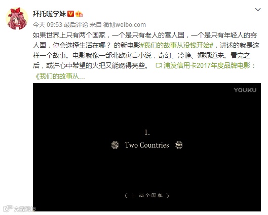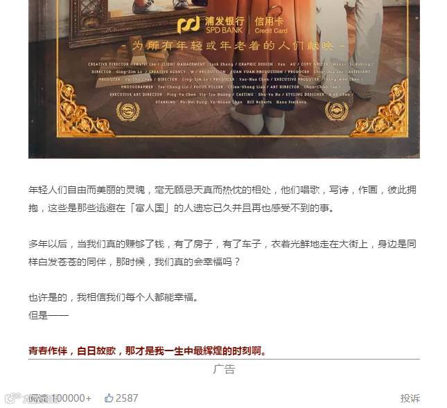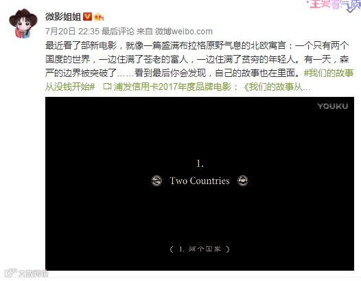 以一家金融机构的视角,塑造了一个只有“穷人国”和“富人国”的虚拟世界,一个与品牌看似毫不相关的话题,却是一部口碑极佳,值得深思的电影。在官微发布后,短时间里视频被迅速传播。走心的制作与触动心灵的故事,提升浦发信用卡的品牌形象的同时也为其迅速笼络了一批粉丝。