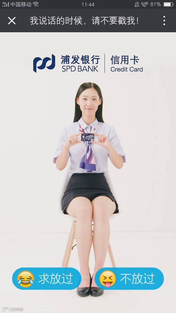 区别于金融行业严肃正经的广告,浦发银行发出了一条搞怪的H5,在信用卡4.0时代、多家银行各自发力获取关注与产品营销的时候,浦发信用卡以不一样的画风,迅速在朋友圈,社交圈,刮起一阵小旋风。