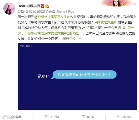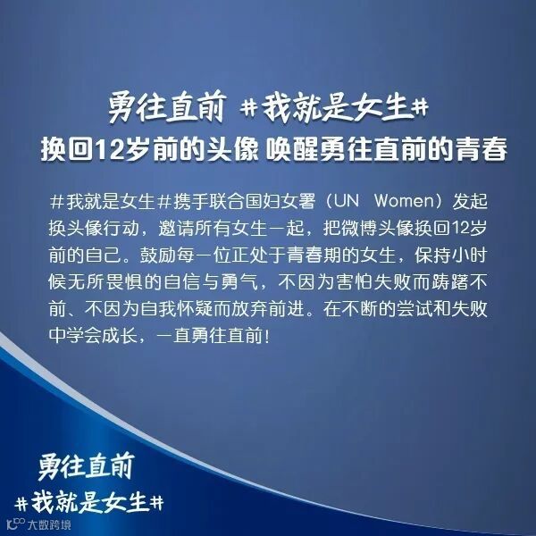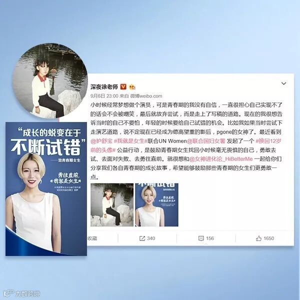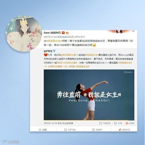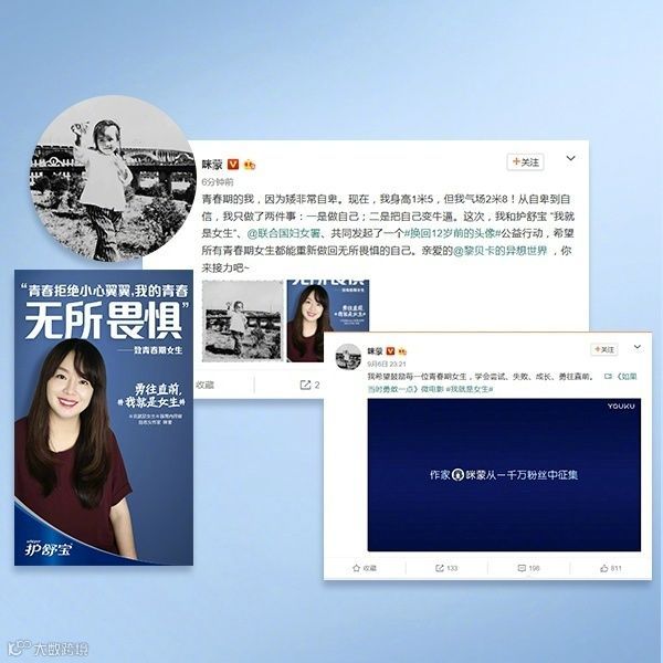 除此之外,护舒宝联合联合国妇女署还举办了“换回12岁头像”的活动:演员迪丽热巴、深夜发媸时尚号主编徐老师、咪蒙等领头行动,鼓励所有青春期的女生保持勇气、无所畏惧。
