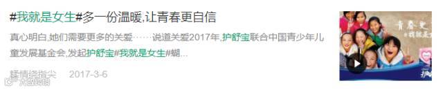 护舒宝作为宝洁旗下的卫生用品品牌之一,拥有众多女性用户群体,联手同样有众多女性粉丝的咪蒙,以不一样的广告方式,为处于青春期的女生发声,表达了护舒宝的品牌态度。
