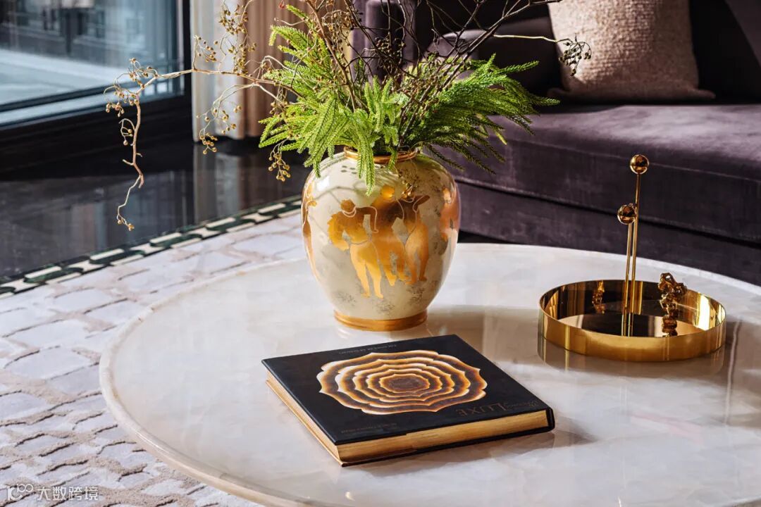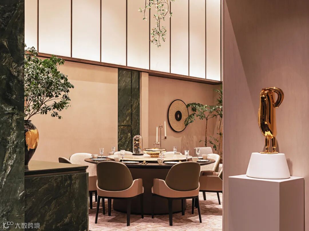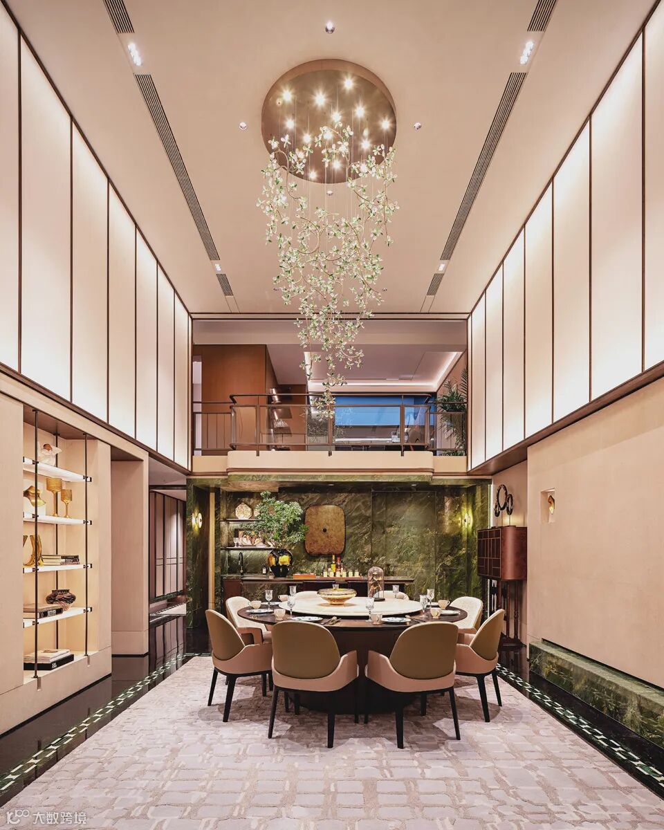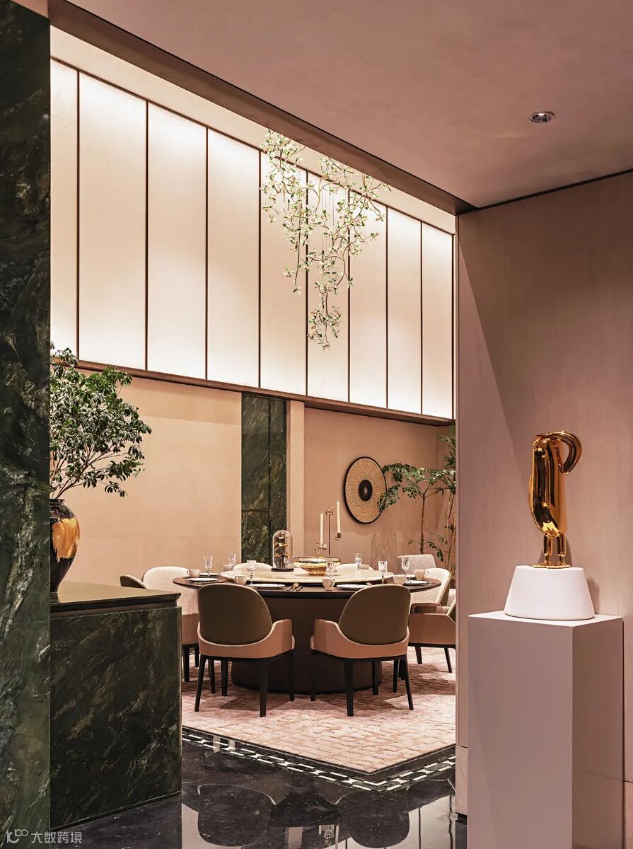 戴勇设计的软装方案堪称“可居住的艺术”。负二层家宴及社交空间以绿色水晶定制的大型花瓣吊灯,与西班牙艺术家亚米海因的金色小鸟碰撞出时空涟漪;主卧床头背景墙的金箔艺术画,在灯光下流转出银河般的星辉。