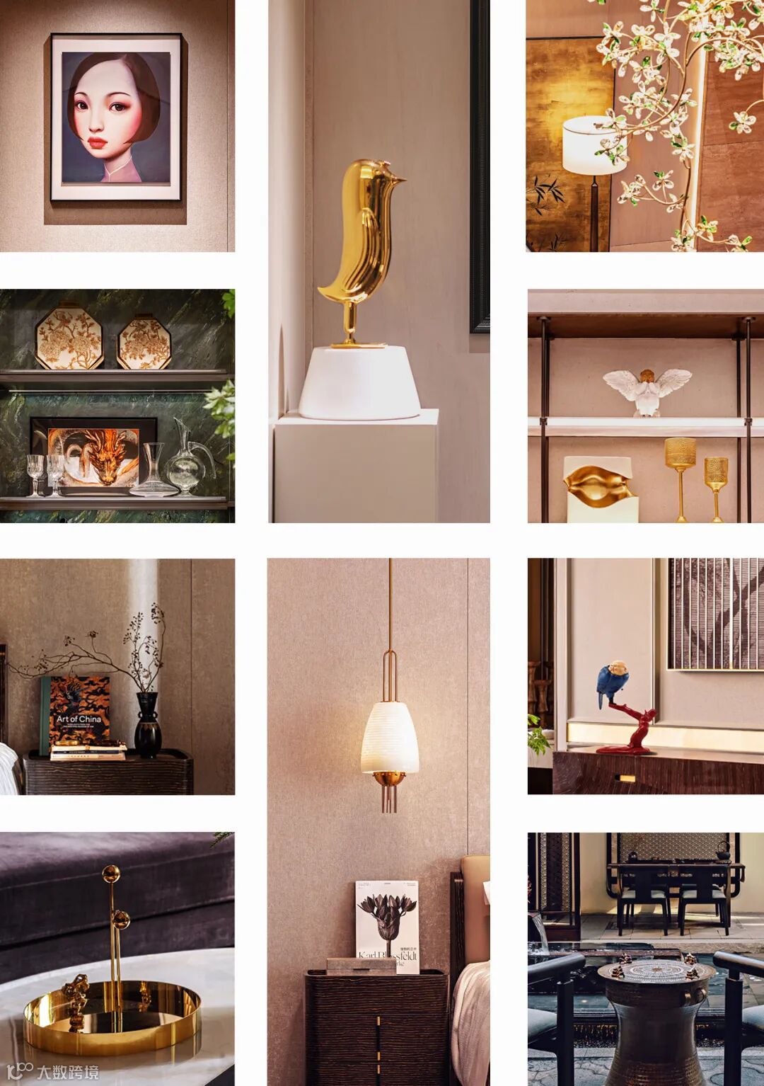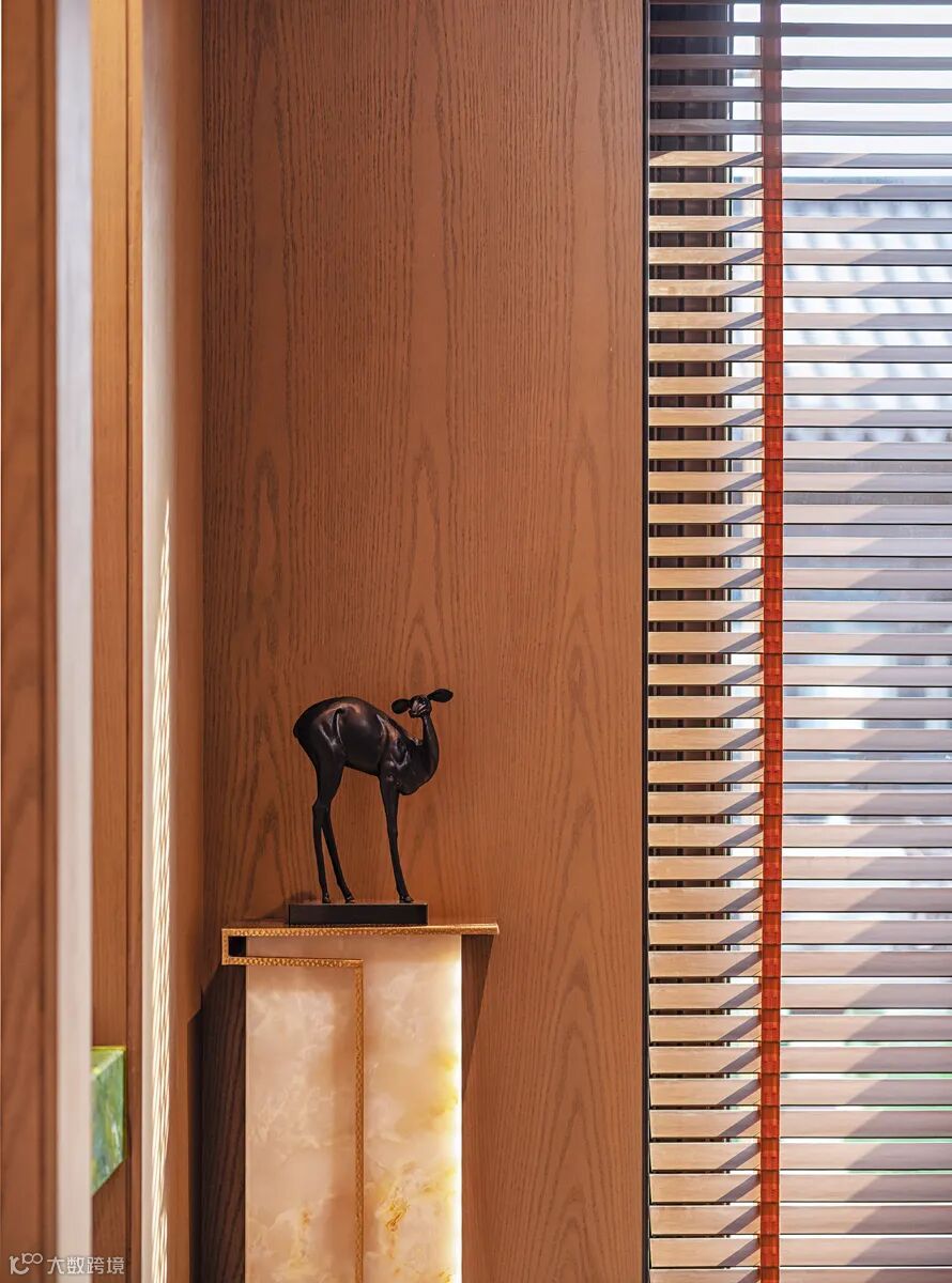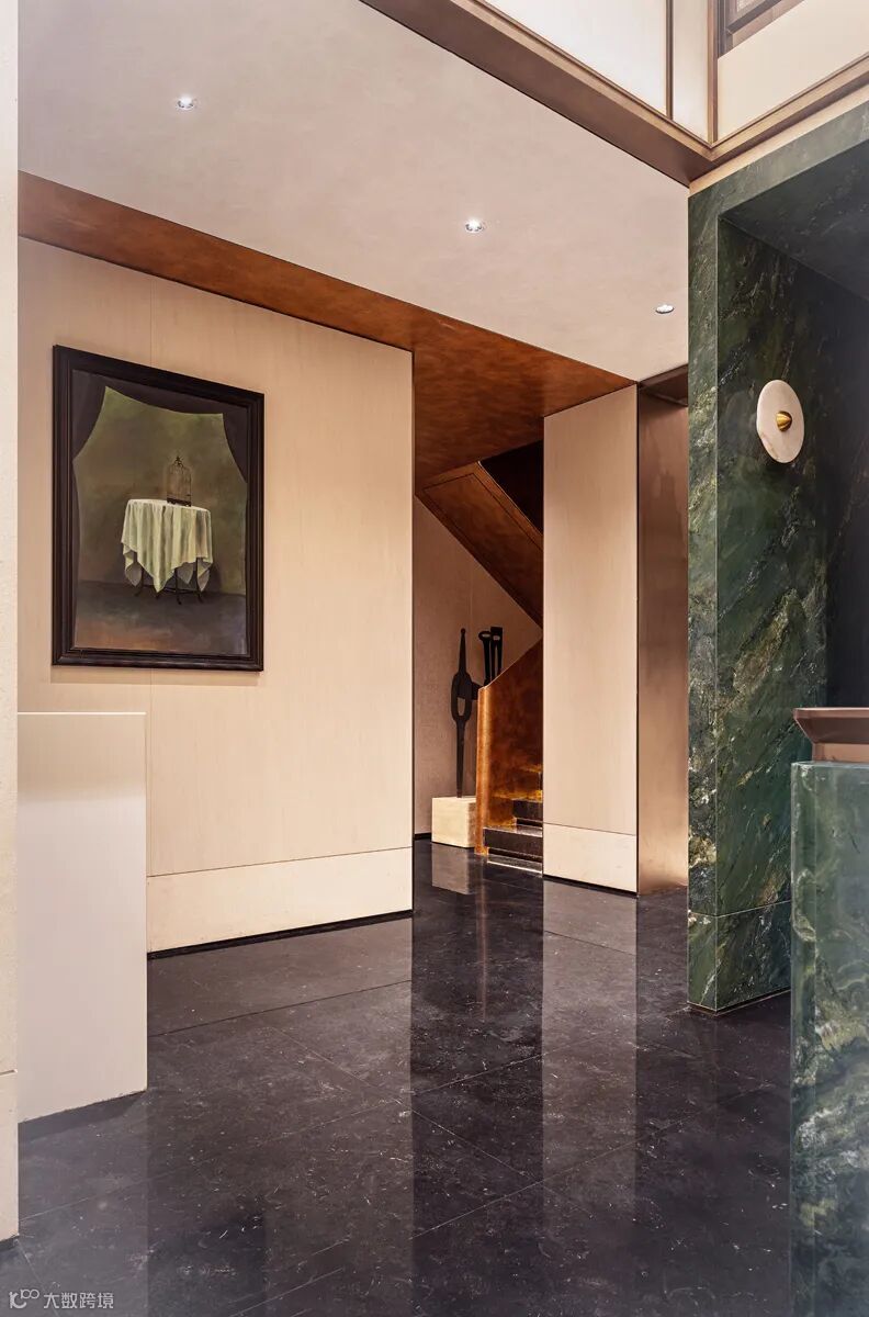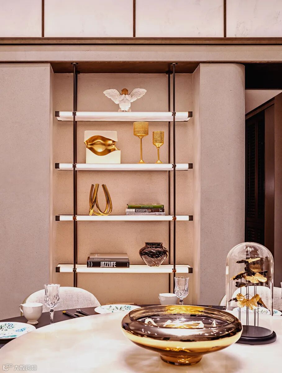 戴勇设计的软装方案堪称“可居住的艺术”。负二层家宴及社交空间以绿色水晶定制的大型花瓣吊灯,与西班牙艺术家亚米海因的金色小鸟碰撞出时空涟漪;主卧床头背景墙的金箔艺术画,在灯光下流转出银河般的星辉。