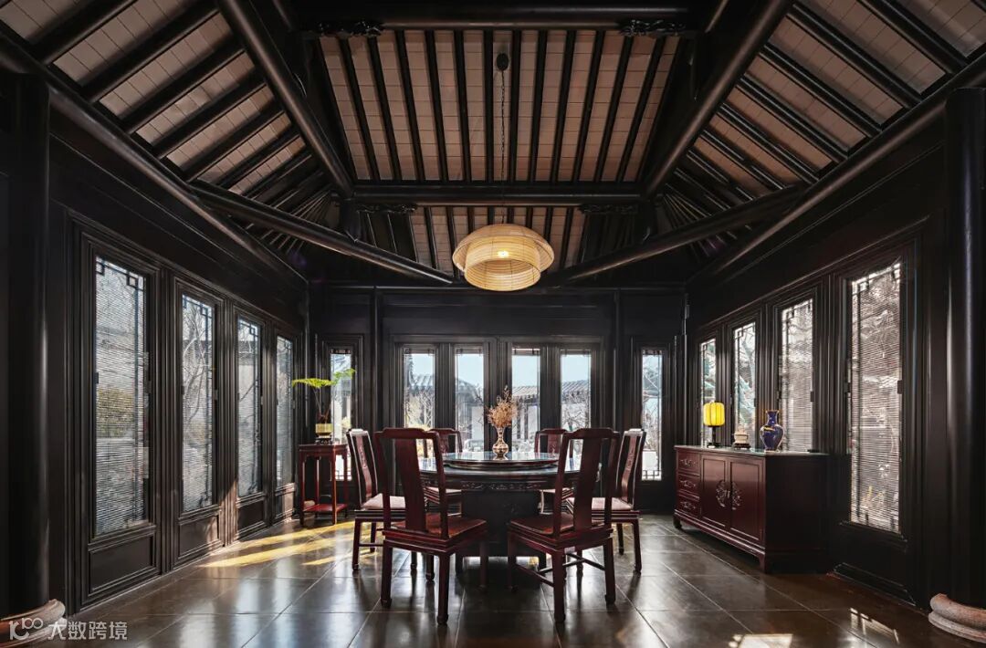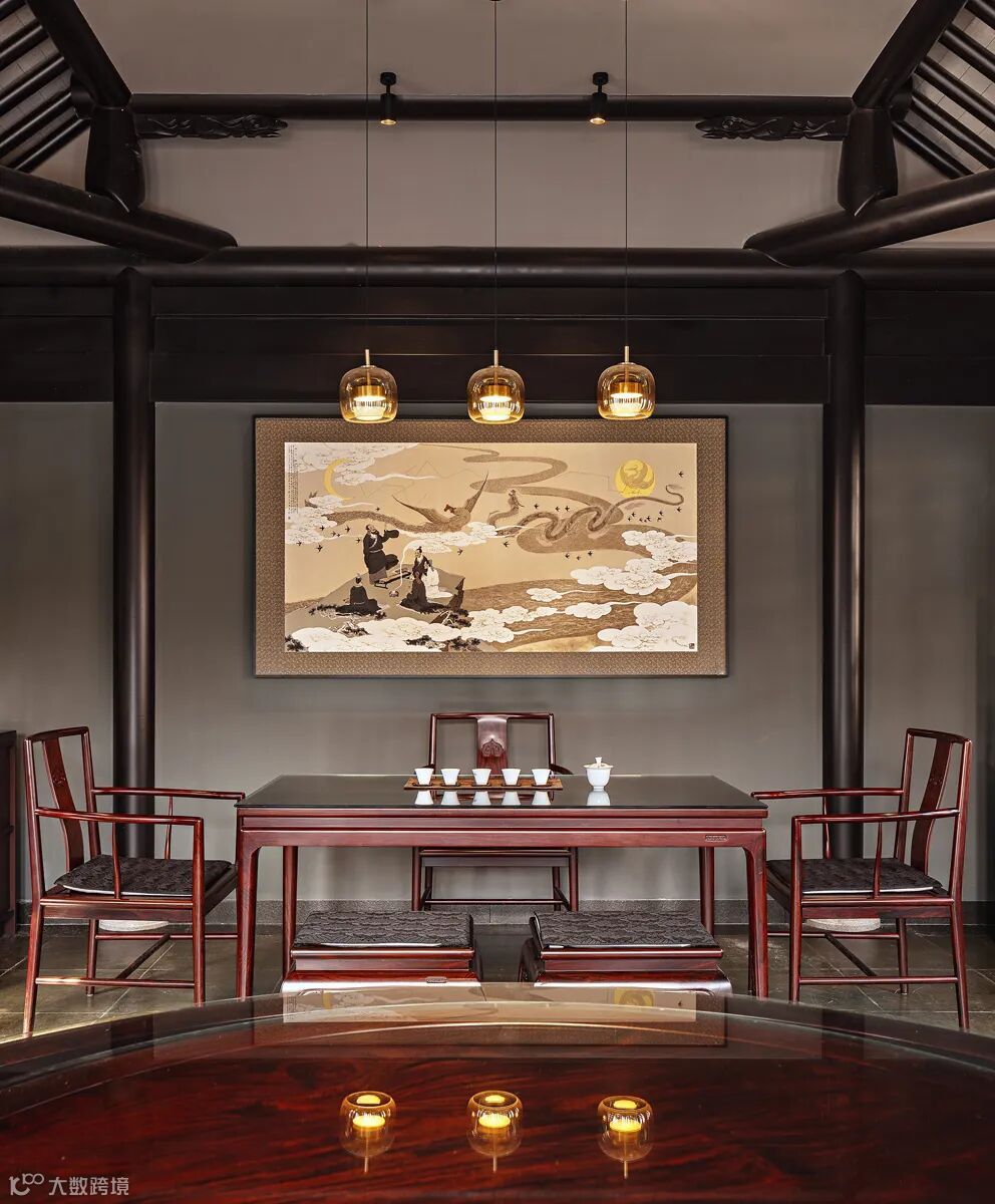 水榭悬挑于水面,可俯瞰水中倒影,可观赏游鱼,还可抚琴品茗下棋书画闻香,不失清雅之境。水榭“暖阁”家宴厅由传统建筑营造方式建造,坡顶梁柱结构。三面落地门窗,可开可合。在此品茶论道,宴请宾客,“谈笑有鸿儒,往来无白丁”。茶桌背景墙的挂画来自当代画家、山东画院院长孔维克的《一山一水一圣人》。