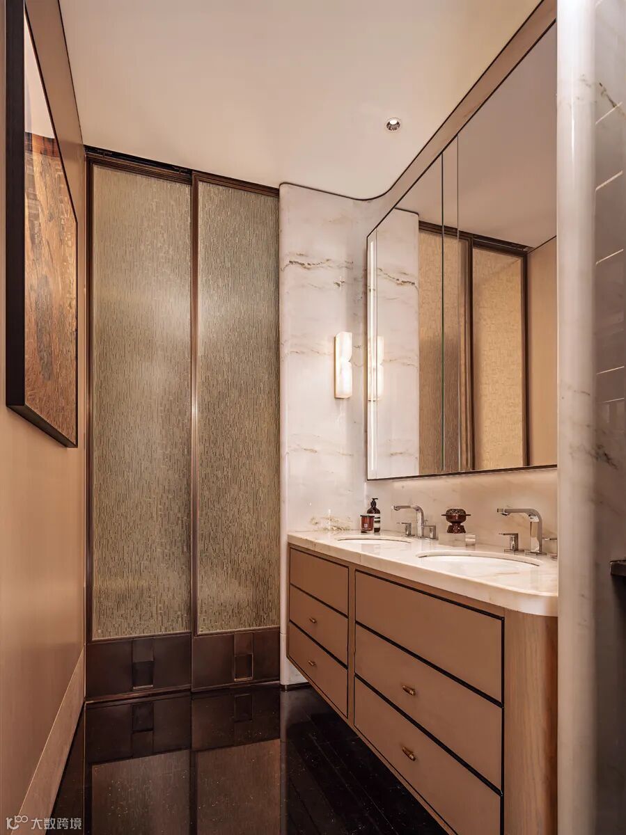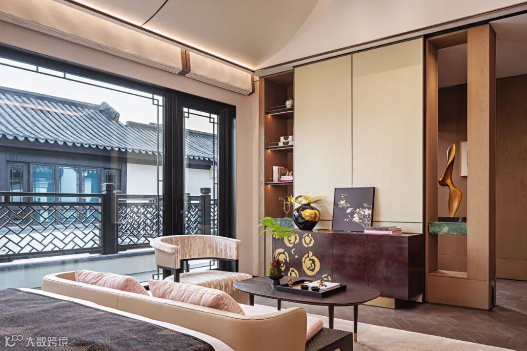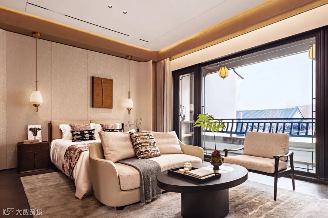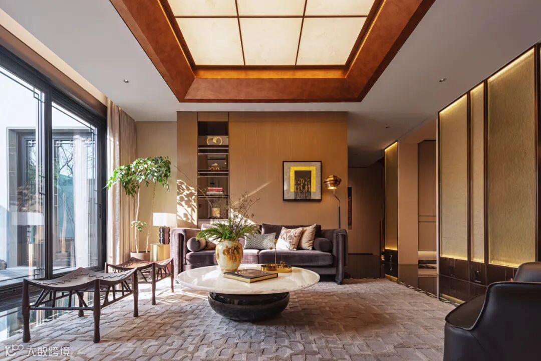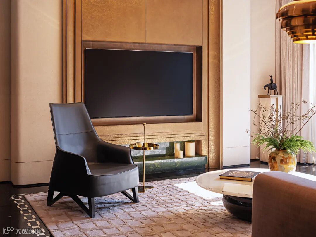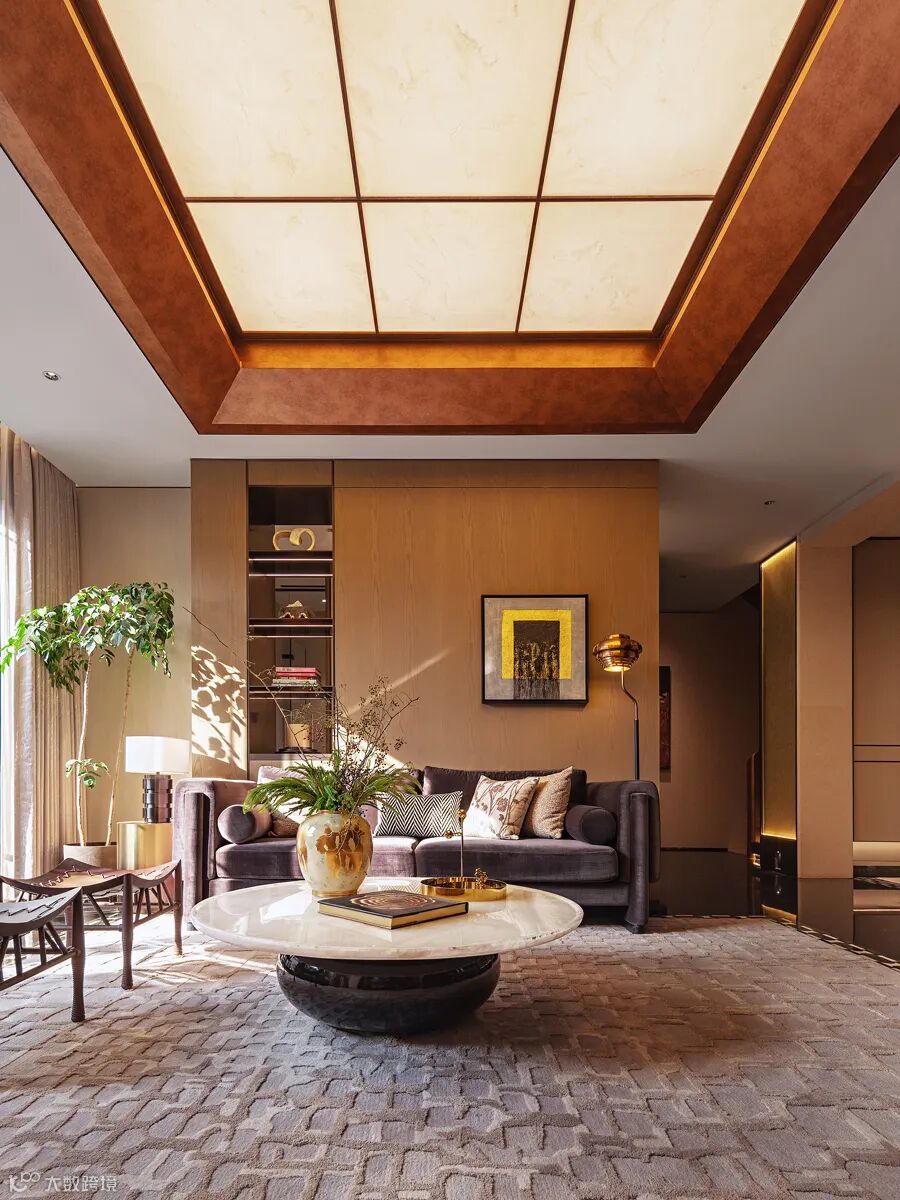 一层客厅及客房以温润淡雅为主调,材质的“柔”与质感的“奢”相互碰撞,有序、丰富、松弛、层次分明,悄然释放休憩空间精奢的质感之美。