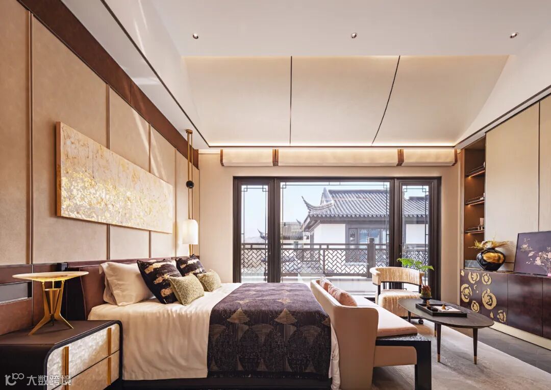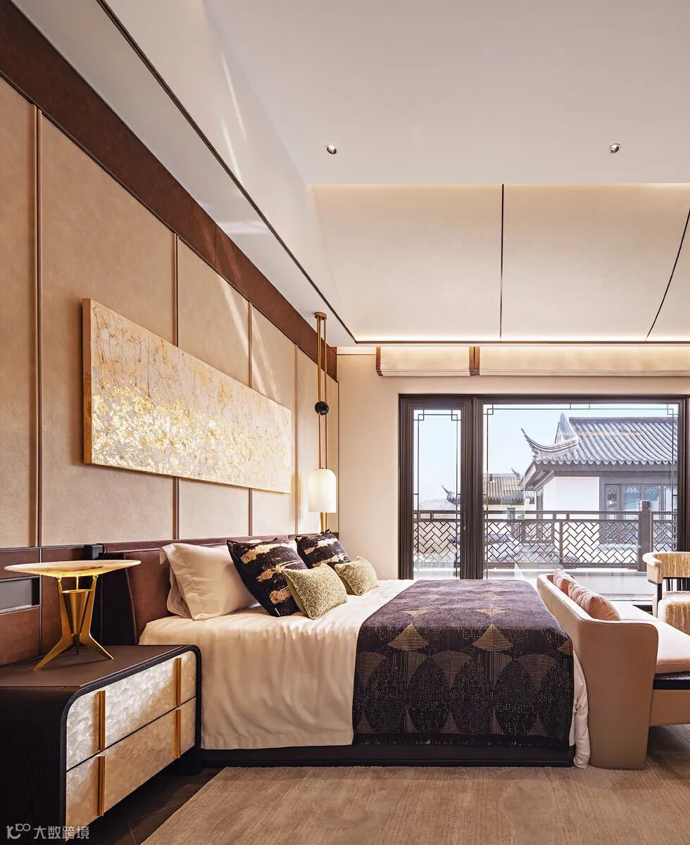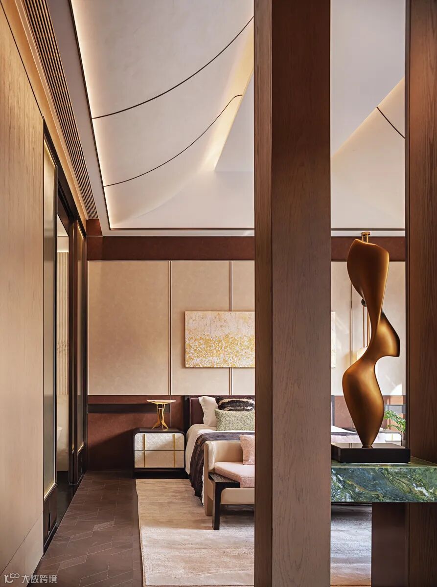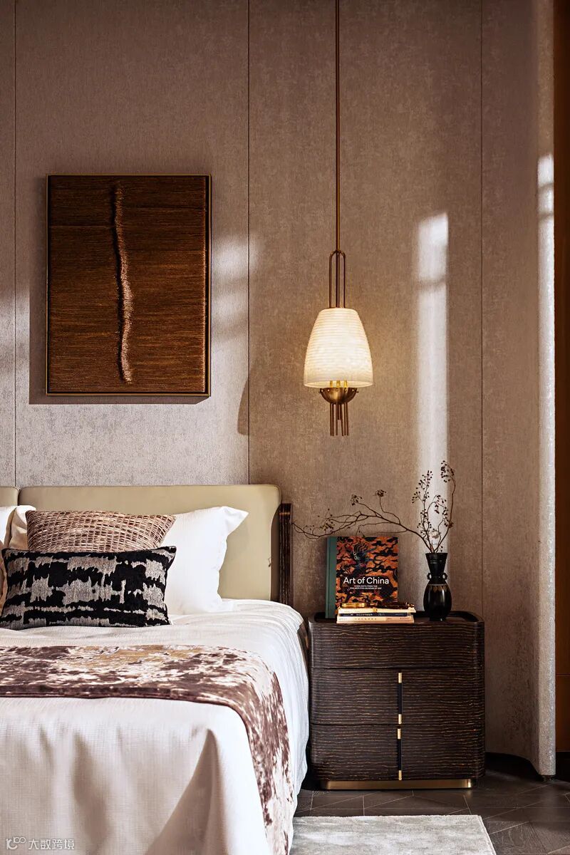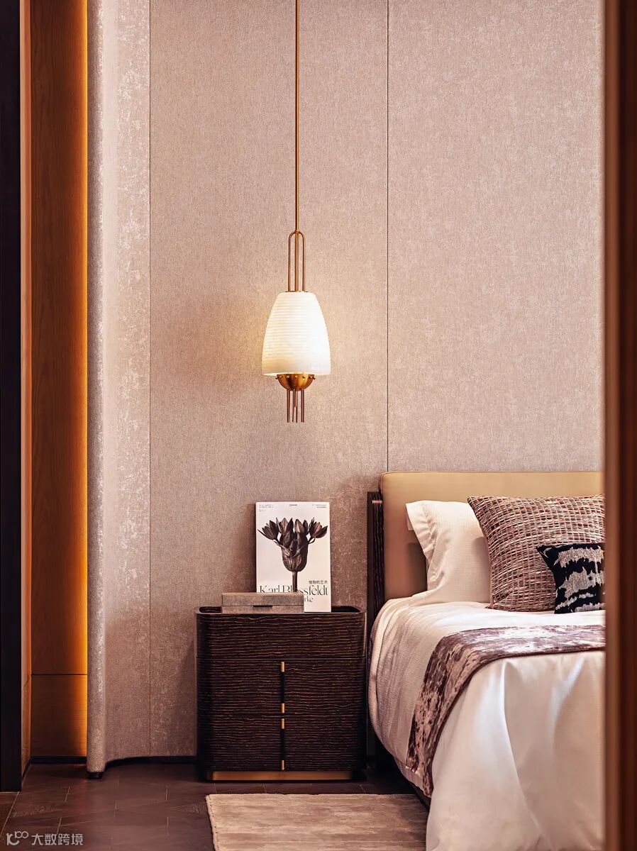三层主卧以东方之诗意若隐,回应现代主义之阔达,呈现诗意自然与时尚摩登并存的气质。灯光与艺术挂画相映成趣,结合恬意悠然的色彩搭配削减空间厚重感的同时,亦能呈现出多元交织的动人细节。