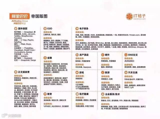 阿里巴巴在2015年涉及的业务包括:国外版图、O2O、电子商务、泛文娱体育、金融、教育、房产酒店、旅游、医疗健康、硬件、游戏、企业服务/技术、SNS社交、汽车交通等。