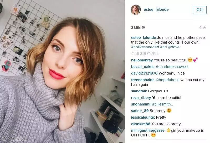 有趣的是,虽然名为“不需要赞”、 “无需点赞” ,Instagram 上一张来自 YouTube 红人 EstéeLalonde 的自拍点赞数已经超过了3万,并且大多数评论都类似“你真美”。