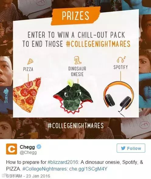 在线教育网站Chegg给学生们提供了实用了暴雪天气建议:参加Chegg的活动,赢取Spotify、恐龙连身服套装和披萨外卖。