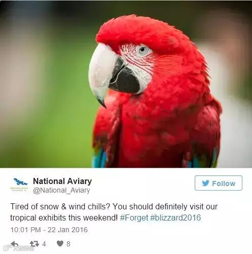 到处都是雪景,美国国家鸟园(National Aviary)欢迎人们来看看热带风光。