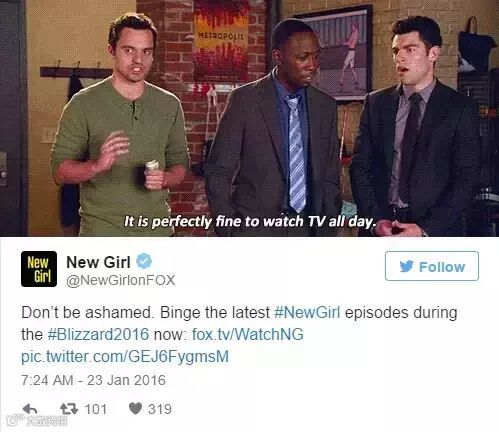 暴雪天气,美剧《New Girl》建议你宅在家里看剧。