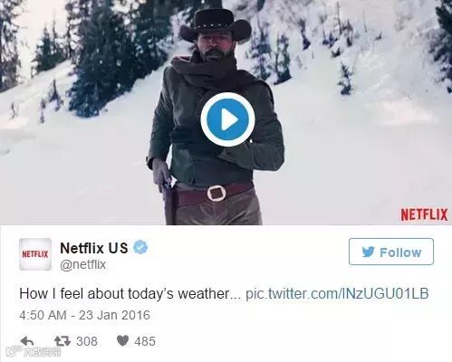 Netflix则用一段霸气短视频表达了此刻的心情:牛仔朝着一个巨大雪人身上花式射击。
