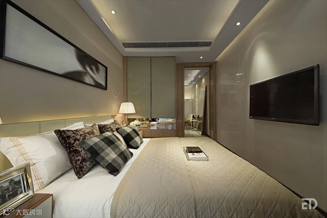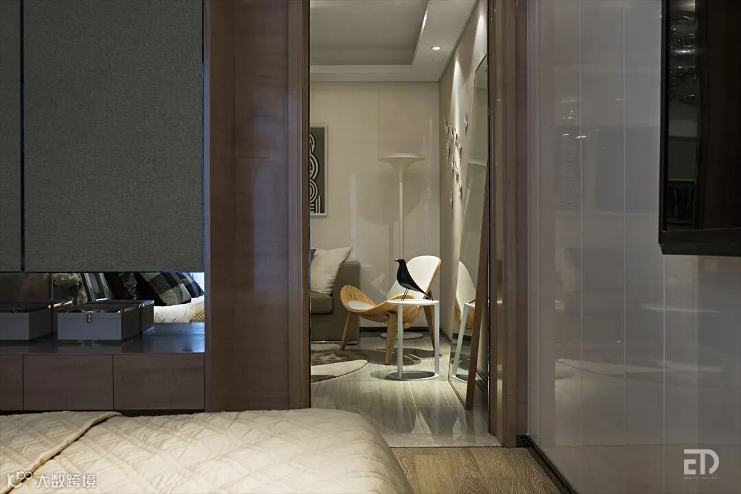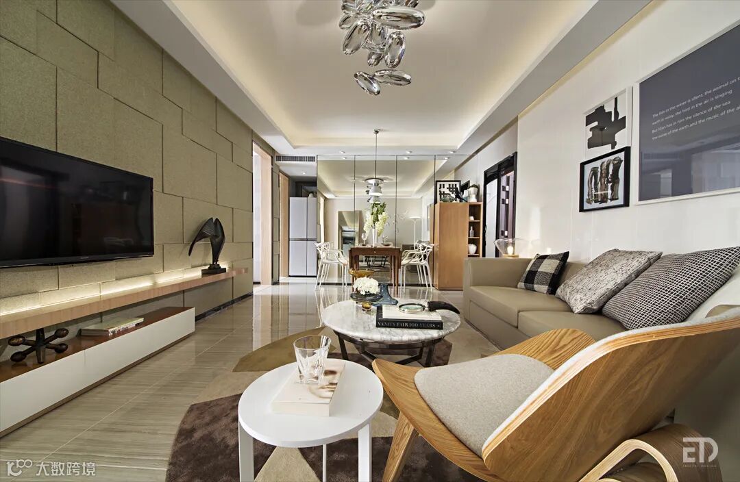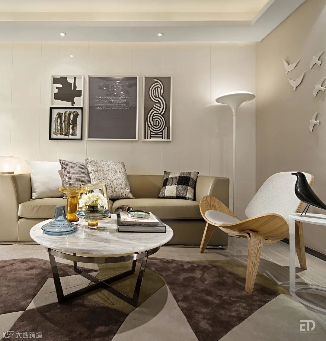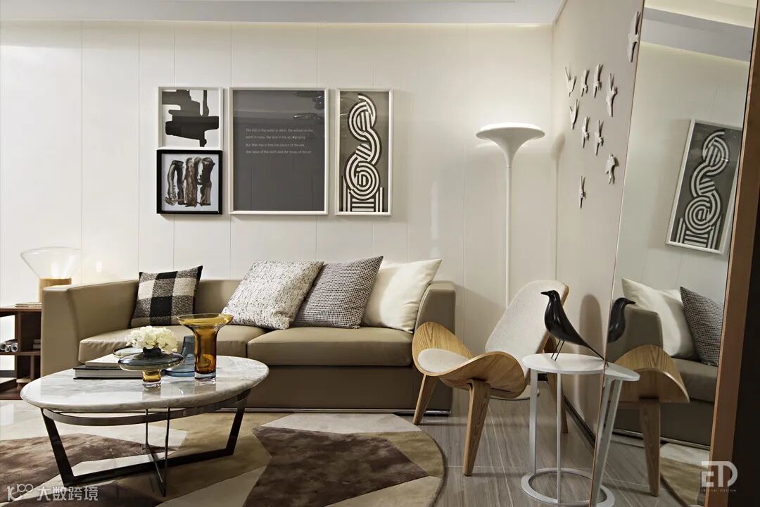 样板间设计以素净高雅的米色为主调,在简练的設计语汇中体现出高品质的生活方式。客餐厅开放式的布局,镜面的使用让空间更具延伸感。个性的吊灯、舒适的沙发搭配Shell Chair、精心布置的时尚摆件、挂画,彰显空间品味。卧室以柔和的中性色调营造出温馨舒适感。