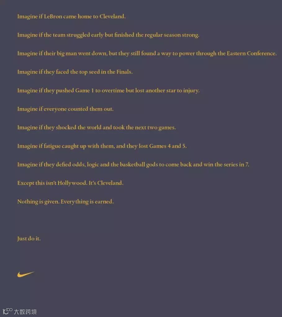 几天之后,Nike 以它的方式对总决赛做了一次回应。它将一份纯文本文案发布在克利夫兰当地媒体 Cleveland Plain Dealer 上,没有绚丽的图片或者什么最新的移动互联网技术。