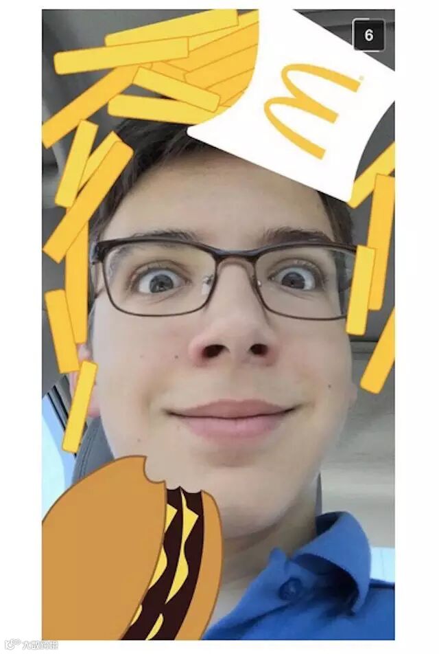 第一个参与进来的品牌是麦当劳。想象一下在美国的 14000 家麦当劳门店发 Snapchat,以后都可以添加“麦当劳赞助版”汉堡薯条贴纸了,比如这样: