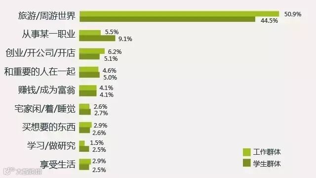 690后最渴望的事情是旅行,其中旅行愿望最为迫切的是工作中的90后,达50.9%,学生群体外出旅行的愿望为44.5%。