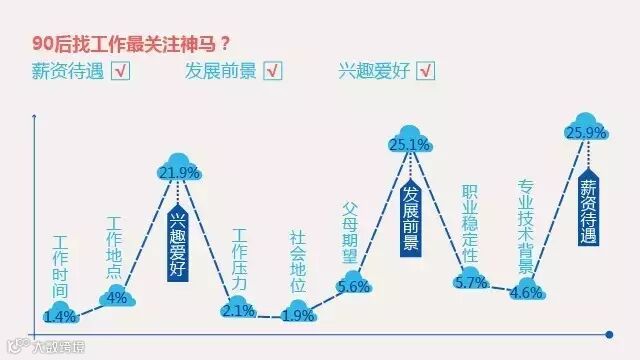 1290后中,有83.5%的人表示不在乎加班。在找工作时,90后对工作时间关注度仅为1.4%,对社会地位的关注度仅为1.9%,位列前三的影响因素依次为:薪资待遇、发展前景、兴趣爱好。