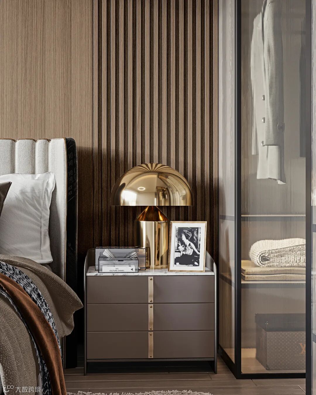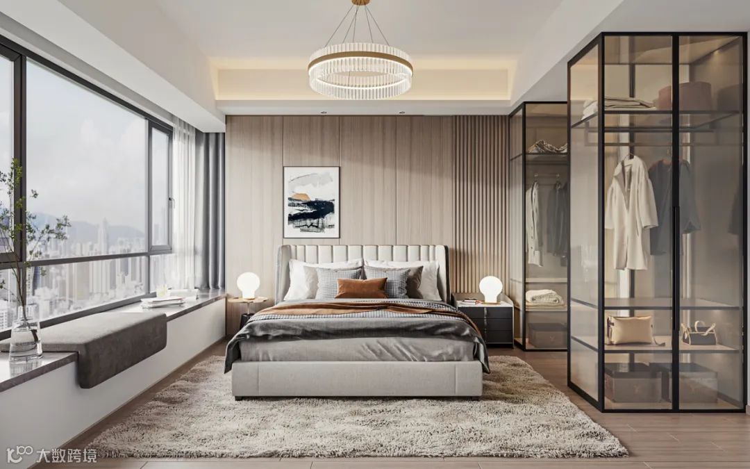 主卧和客卧以木制材质为主进行打造,玻璃和金属等材质的引入则处处流露出轻奢质感。玻璃衣柜的置入使服饰的可感性增强。金属灯具如同一件精致的艺术品,为空间增添了一些奢华的元素。设计唯有在自由和多变之中,才能获得更多不同的可能性。