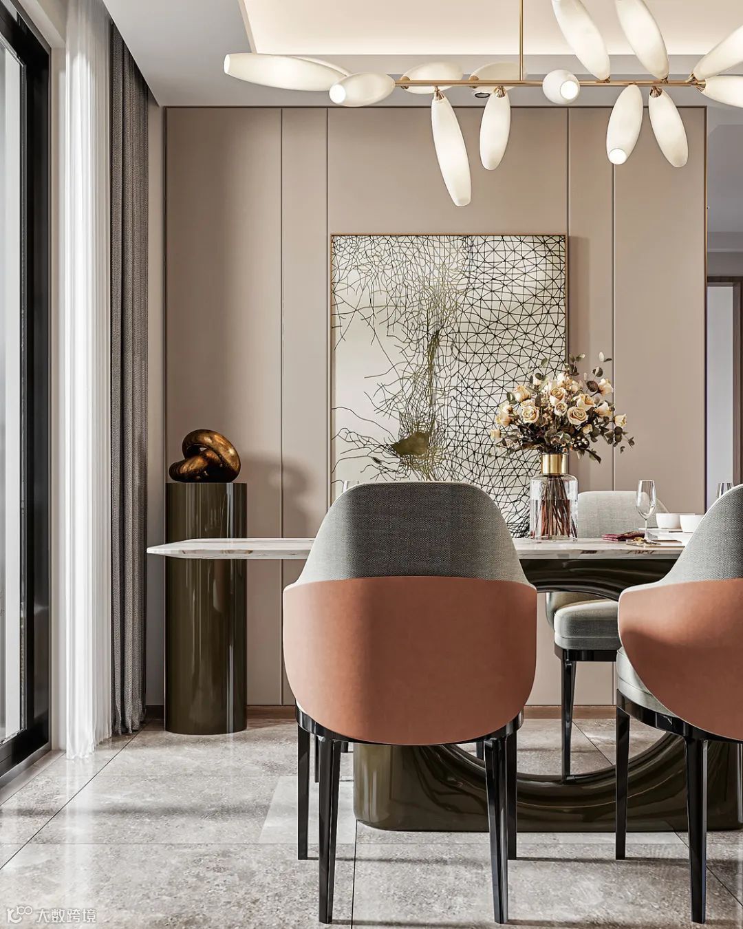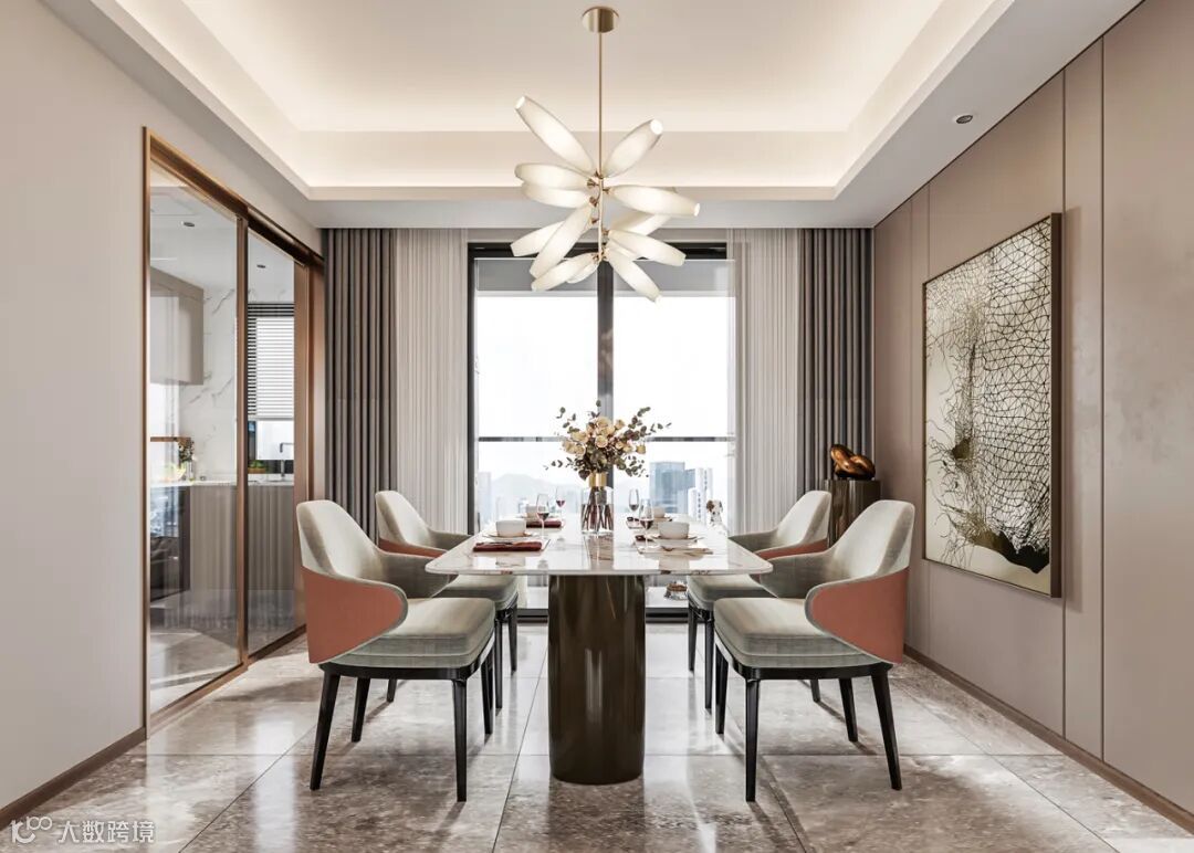 设计师用精致的艺术手法雕琢客餐厅空间中的每一处细节,以恰当的色彩渲染出有温度的、理想的氛围。简洁的背景,抽象的金属挂画,花蕊状的吊灯,这是经典与现代艺术之间的碰撞,这种碰撞所营造出的时尚、轻奢的空间,彰显了现代美学。
