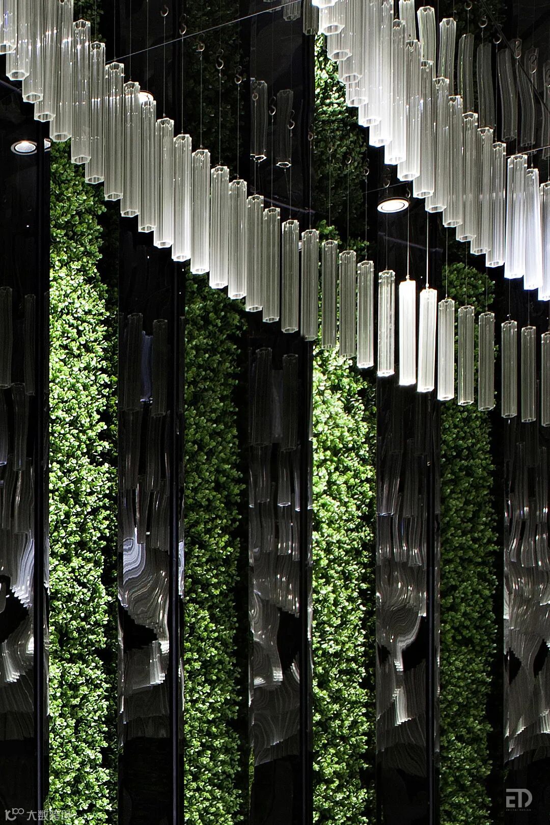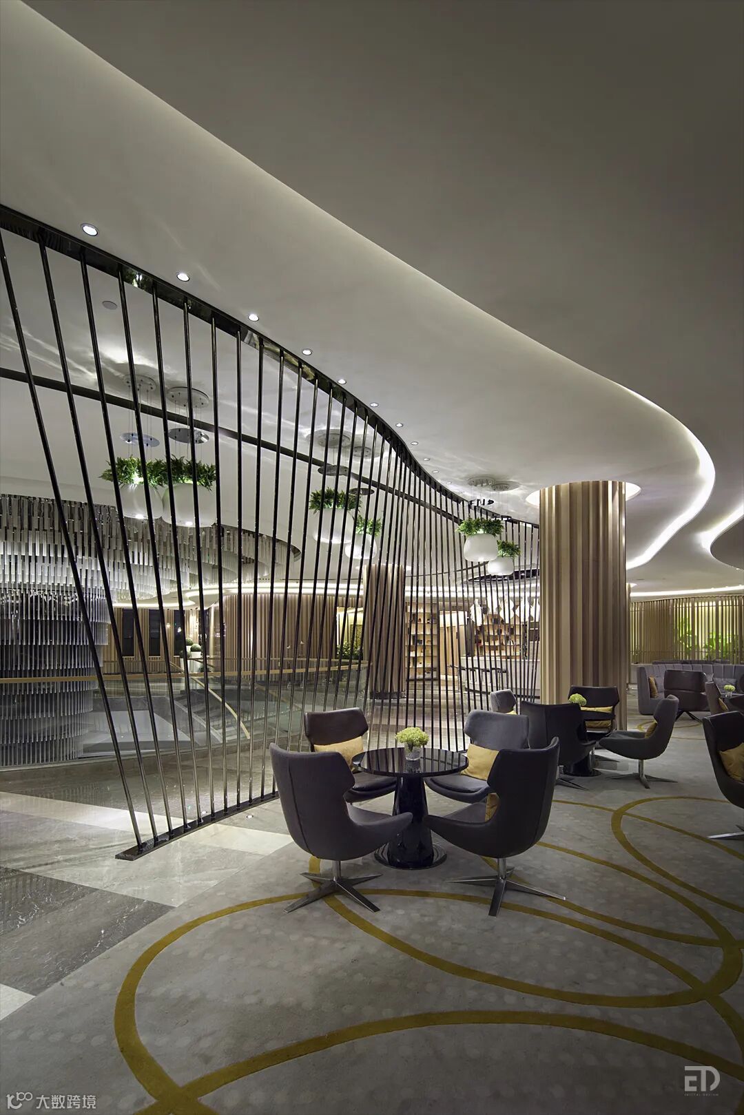 有着放射状图案的地毯、金色的雨丝装饰灯、玻璃细管挂饰、露珠灯、自然主题雕塑、花朵形体的吊灯、橙红的、黄绿色的点缀家具,让空间时尚、奢华、愉悦。