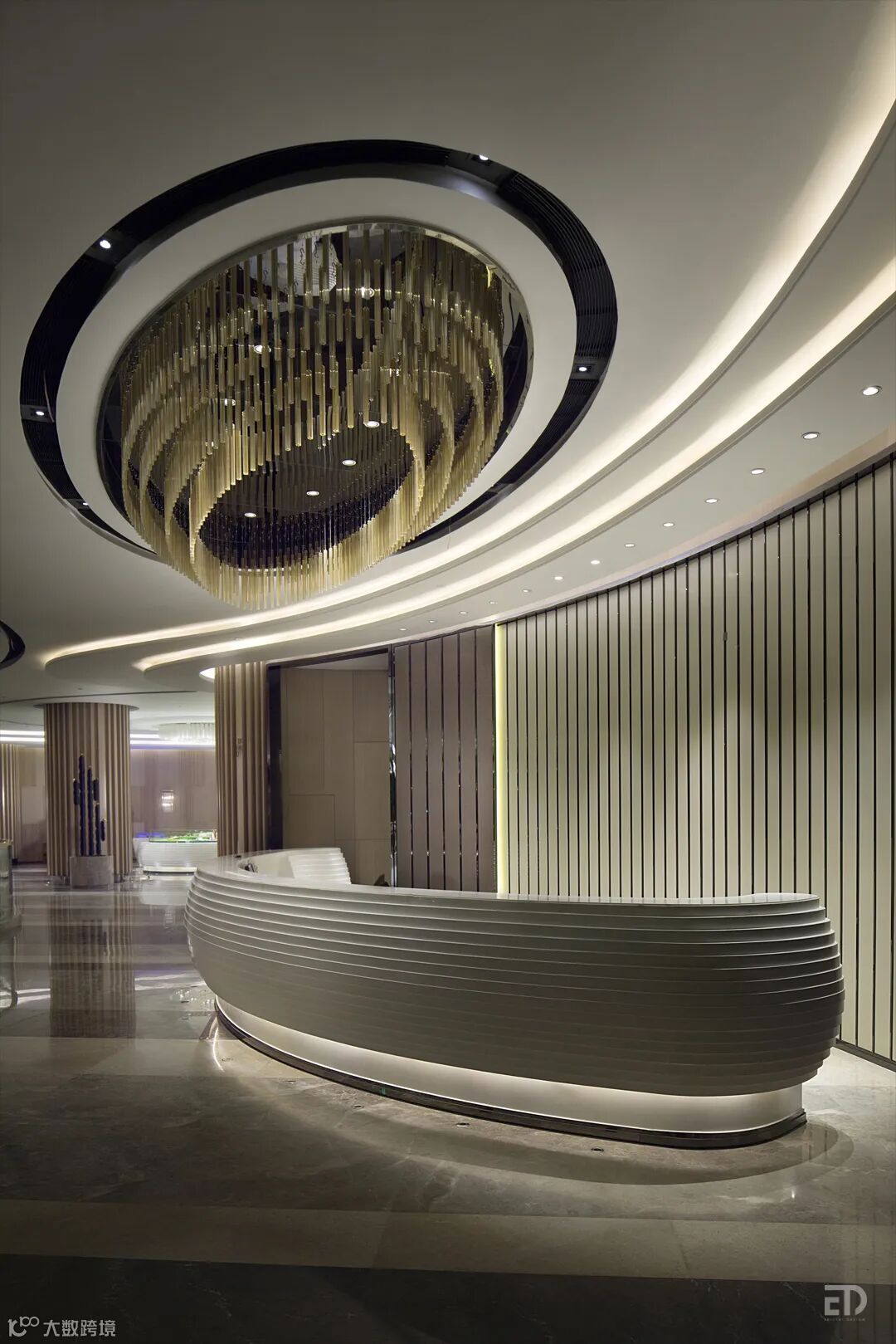 通过垂直电梯来到二层销售中心,客人从幽暗的空间进入骤然明亮的接待大厅,流线型的天花造型,墙面宽宽窄窄的木柱造型,丰富的灯光变化,地面深浅不同的大地色石材组成的富有引导性的线条,带给人舒缓、自然并富有变化的空间感受。