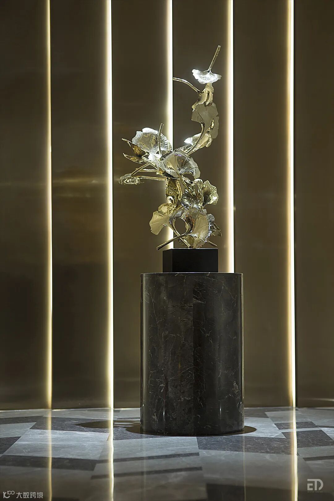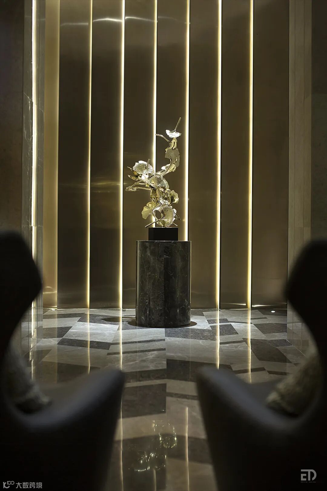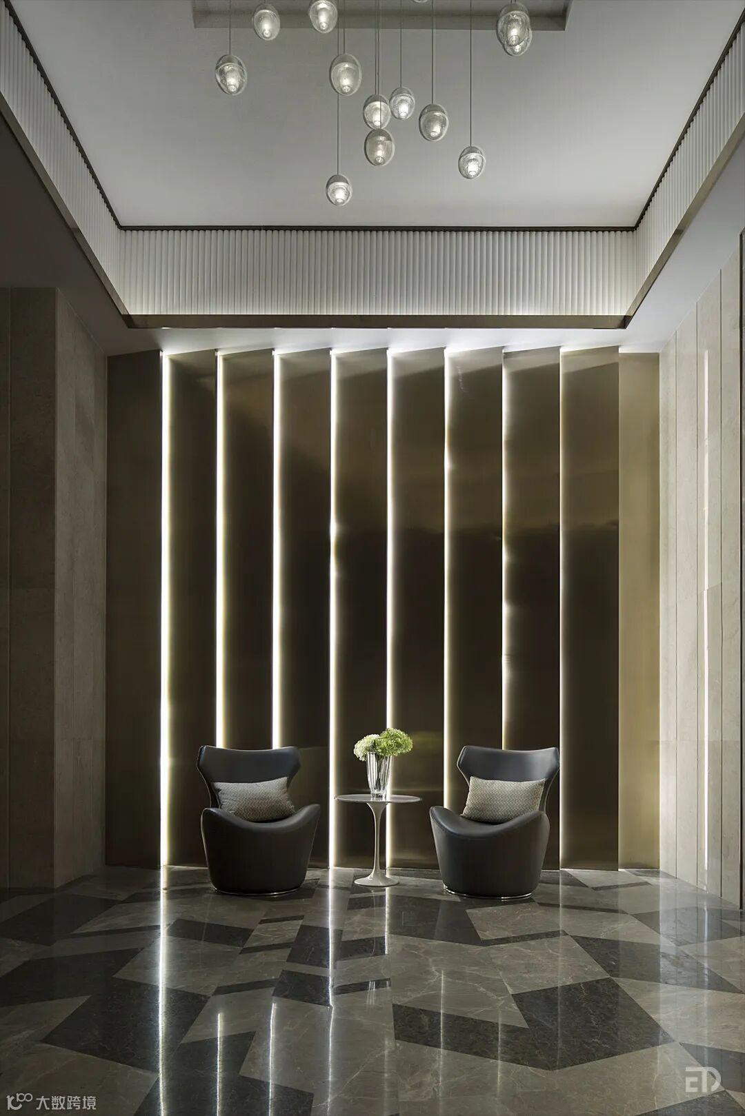 戴勇设计团队还负责了公共空间的设计,首层住宅大堂延续营销中心的轻奢风格,设计师用精致的艺术手法雕琢空间中的每一处细节,以恰当的色彩渲染出有温度的、理想的氛围。