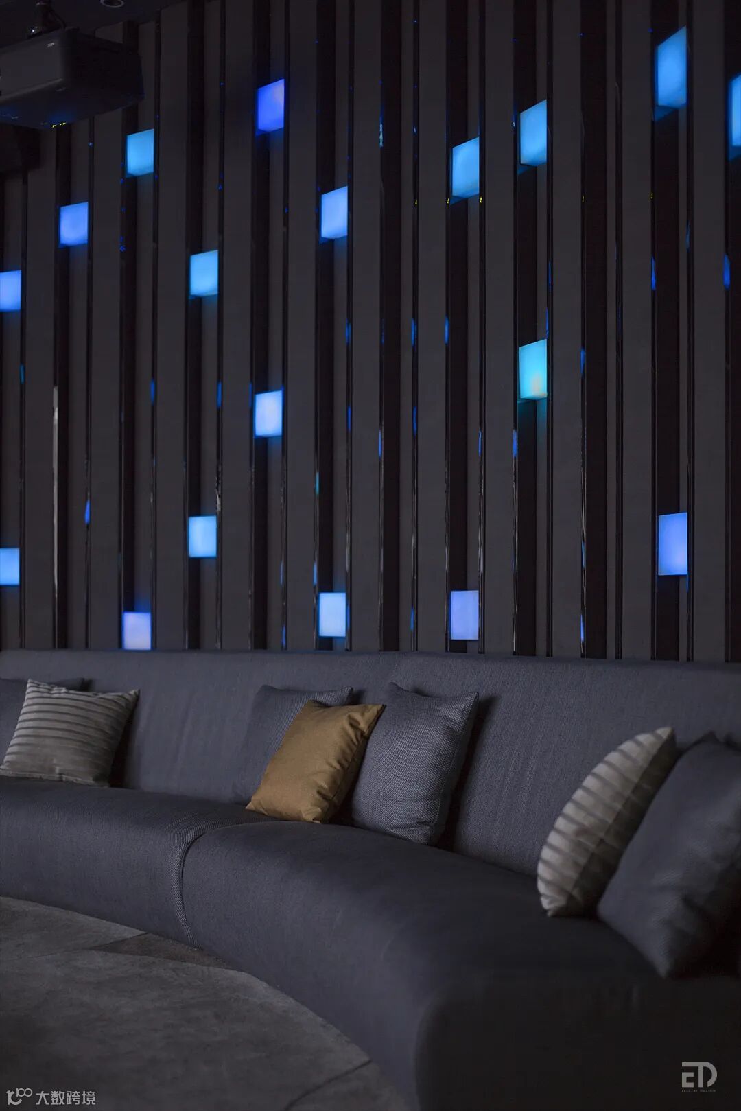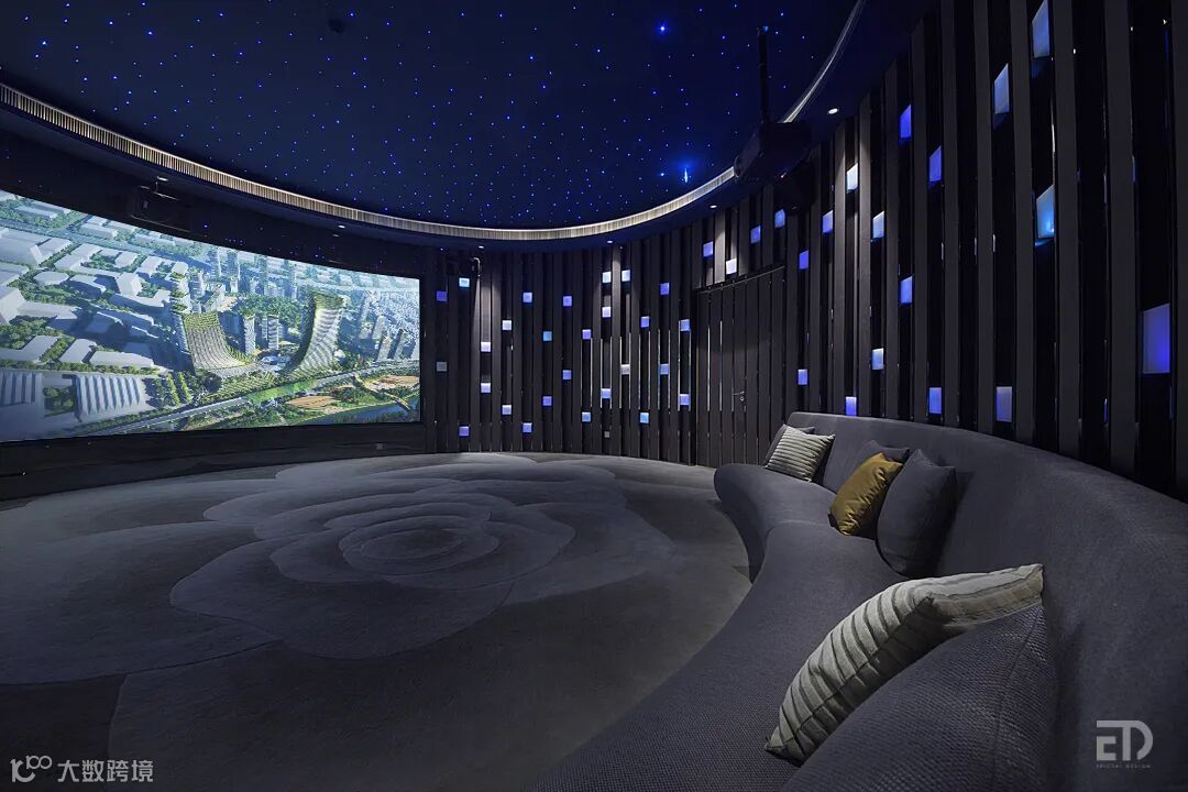 椭圆形多媒体展示厅给人奢华的感受,星空顶天花和布满内发蓝光方块的造型墙面营造出一个神秘而又特别的空间。