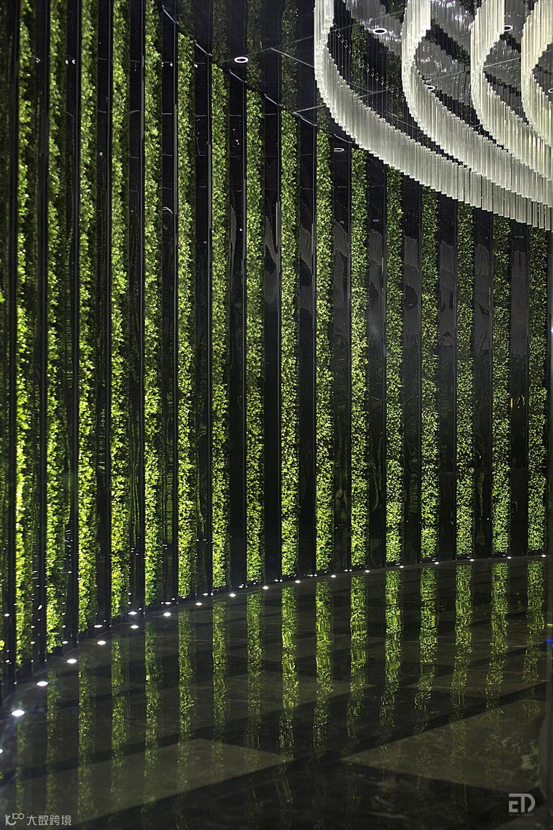 营销中心的场地原为两层商铺,戴勇设计团队为解决交通流线,把两层商铺用旋转楼梯上下贯通,一层为入口大厅和多媒体展示厅,客人通过旋转楼梯及垂直电梯上到二层销售大厅。营销中心的设计围绕“绿色光明,生态豪宅”的项目定位展开,传达绿色、生态、自然、宜居的设计主题。
