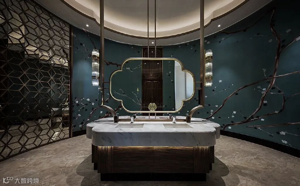 室内糅合中西文化精粹,以寓意福禄吉祥的金碧辉煌作主调,配搭象征平安的山水玉石元素,展现“岭南福邸”的概念。并从岭南传统建筑中汲取灵感,承袭古制,又融会中西;既有地域共性,又各呈异彩。空间整体布局和谐对称,将优雅隽逸的中式意蕴和雍容典雅的高贵气质展现得淋漓尽致,旨在打造传承中国历史文化价值的东方礼居。
