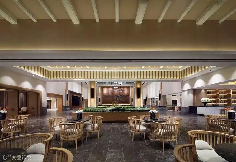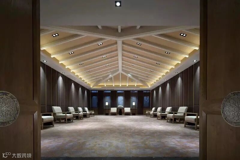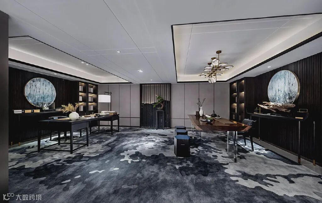 室内把东方传统的气韵蕴藏在宽阔开扬的大尺度的空间中,通过中国传统建筑中轴对称的平面布局和立面构图、中国印象的黑白色调、巨幅的线描中国山水,高耸到顶的中式隔屏,悉心设计的原创中国风家具,呈现现代中式空间的大气场域。
