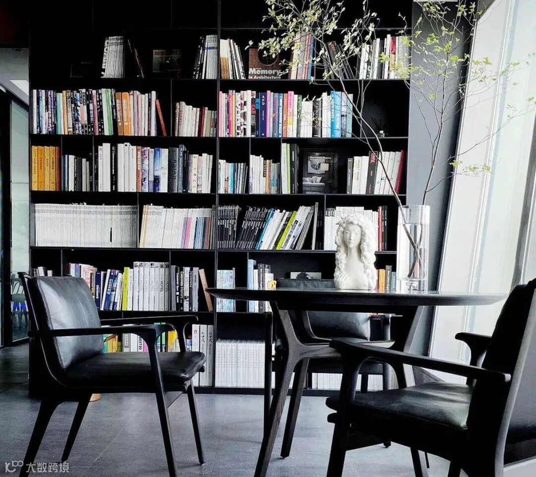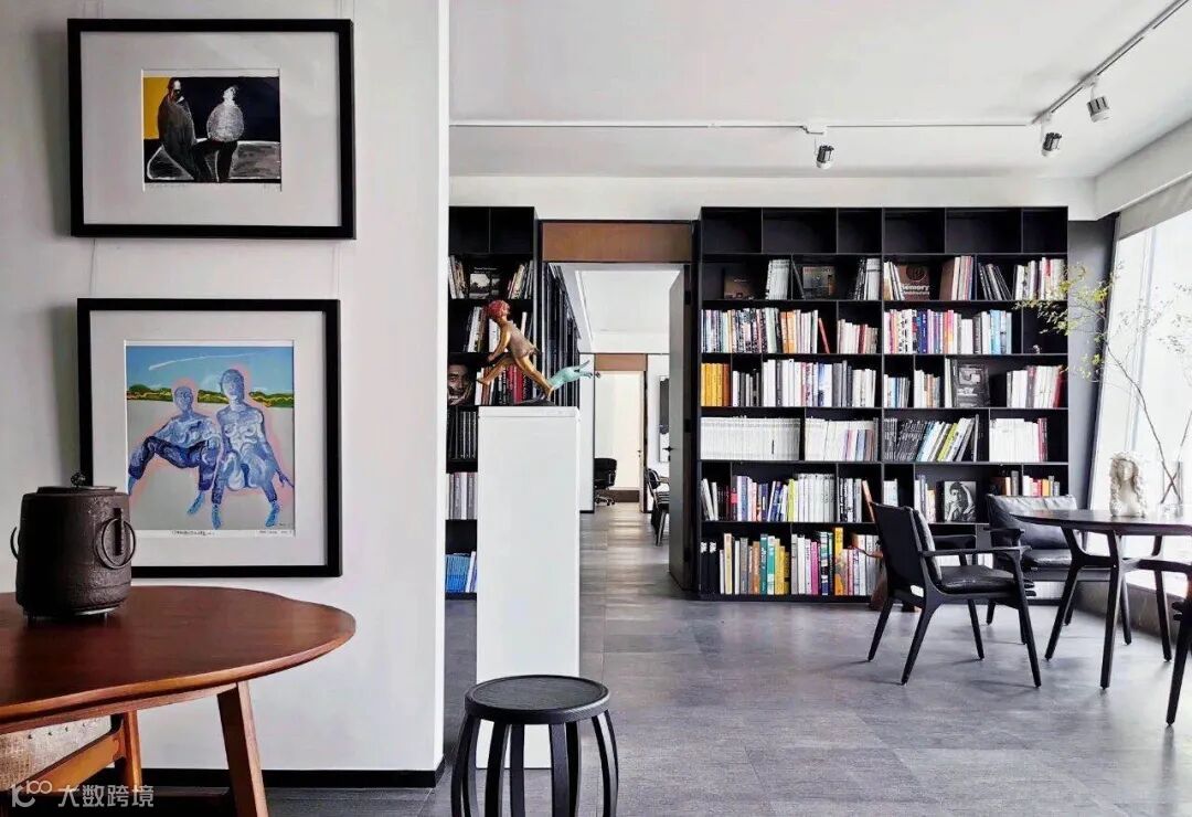 戴勇设计公司办公空间以画廊、书吧的形式作为接待休闲空间,形成独具特色的设计企业形象。使用黑白两色处理墙面,让不同色彩的艺术品可以和谐相处。整面的落地玻璃幕墙,让光线在空间里随意流动,渲染于空间中,让光影之间的转变显得更鲜明和层次。流动的光影与凝固的艺术品谱写动静之美。