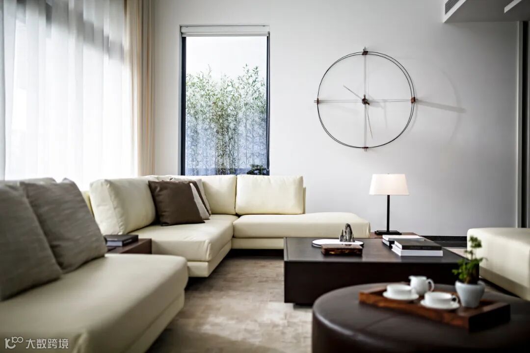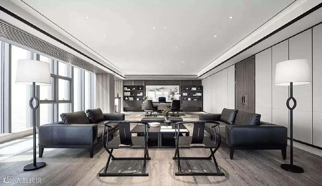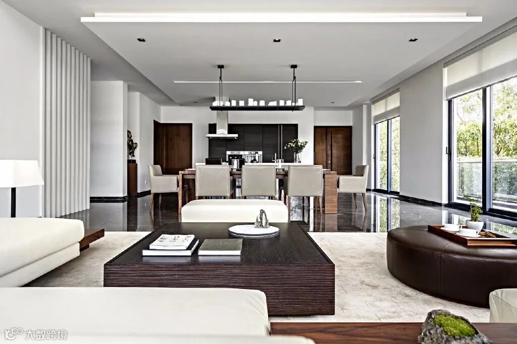 本案以“城市、自然”为设计主题。几何造型的设计语言,反映出设计师对现代空间的自然理念:优雅的格调、方正的品质。落地玻璃窗将户外的自然风景完整引入室内,空间中运用直线屏风提升空间的遮掩度,创造出一种可见与不可见、开放与含蓄、优雅与质朴、坚硬与细薄、独特与实用相互融合的城市、自然空间特点。