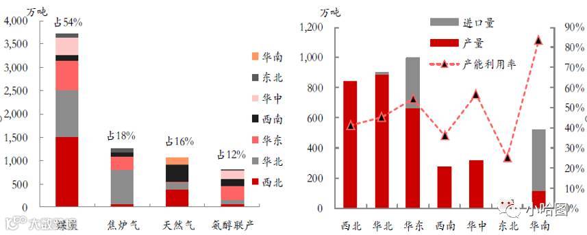 从2015年的产能分布看,甲醇的四种产能中,煤炭作为相对低成本产能占据了半壁江山。然而煤炭的出身并没有保证其低廉的成本,除了内蒙古、陕西、山西、宁夏、新疆、青海等煤炭产地之外,包括河南、山东乃至江浙一带也有部分煤头产能,非西北地区煤头相对成本的劣势叠加煤价的上涨,使得这部分产能不仅毫无优势可言,反而在高煤价的成本泥沼里举步维艰。