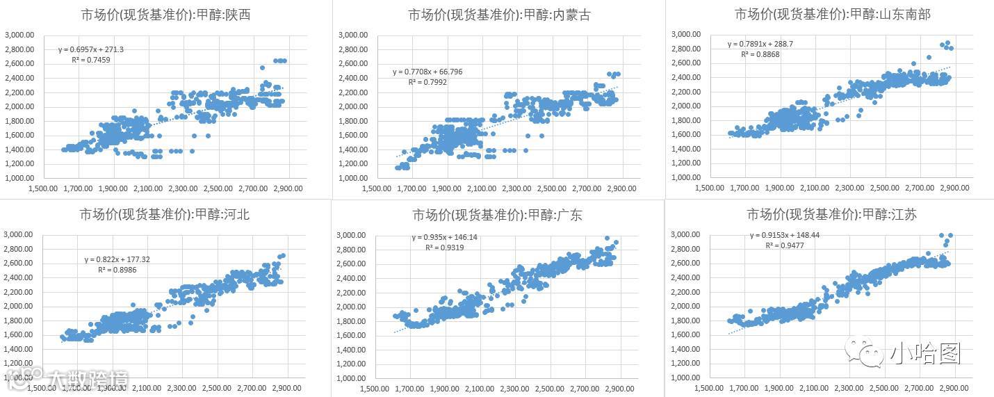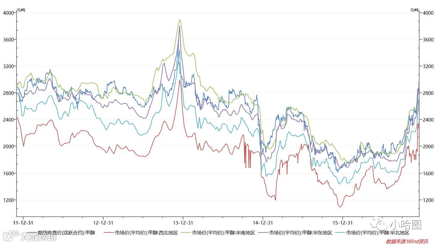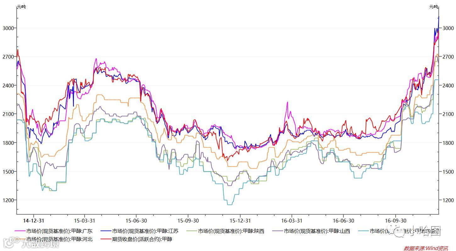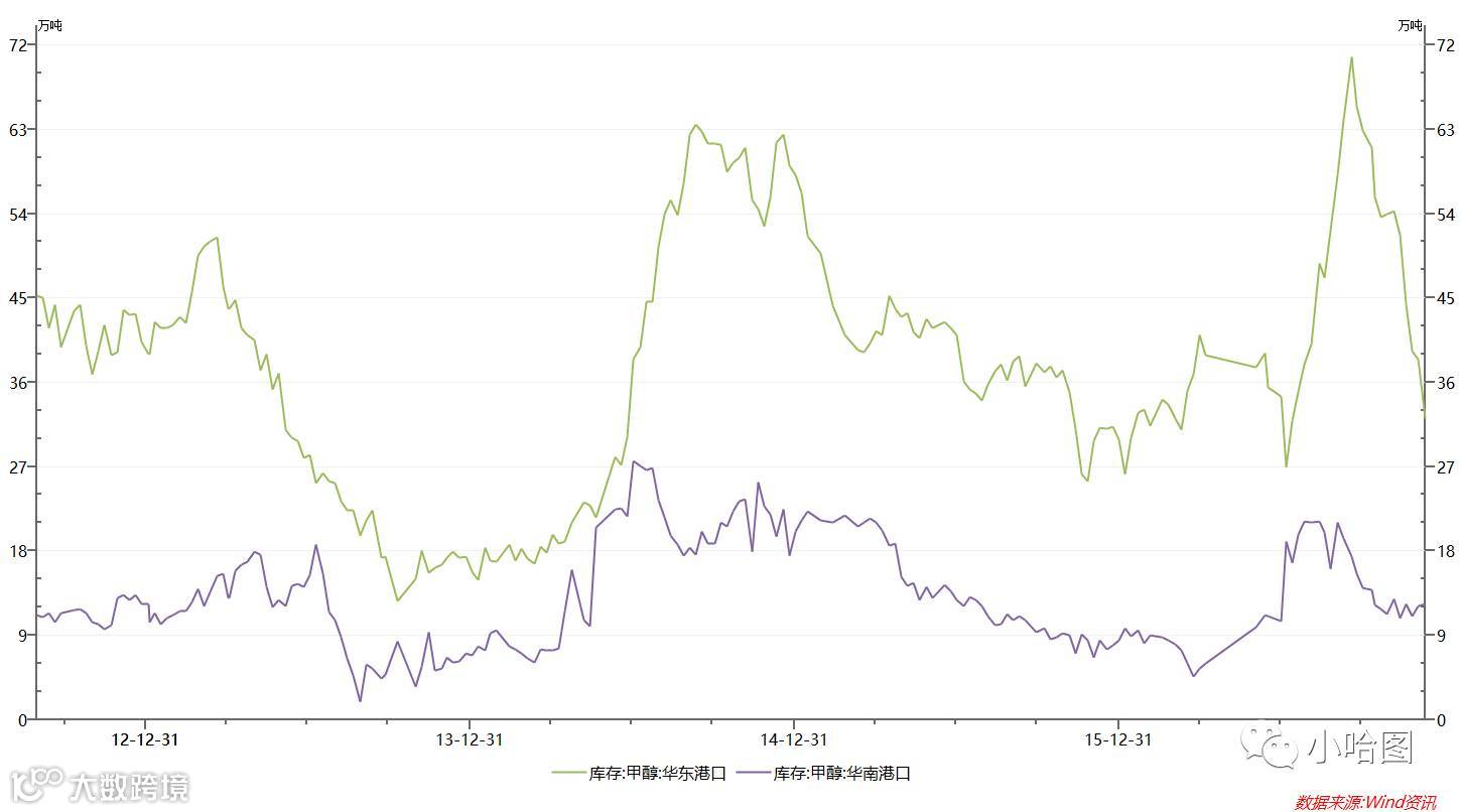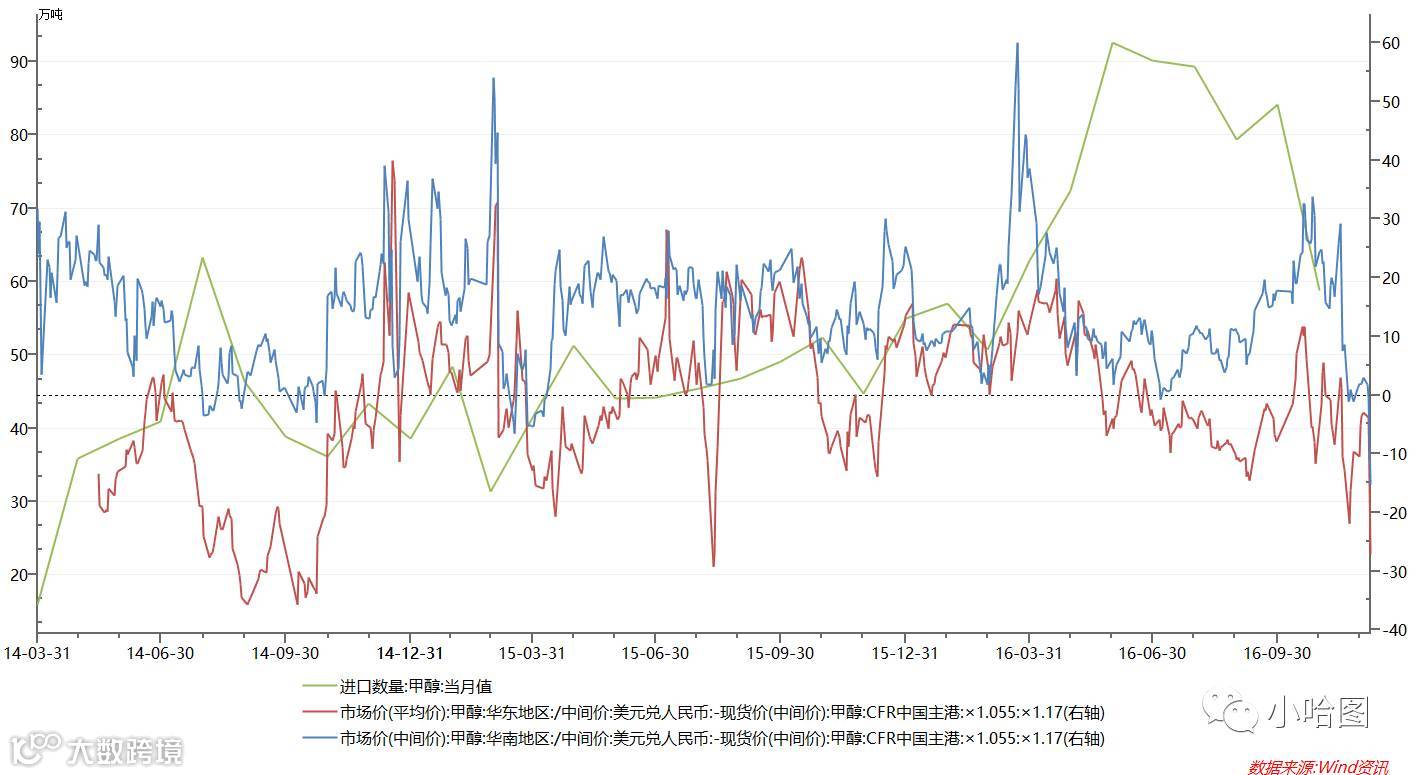 这也很容易理解,由于国内甲醇产能很大一部分都是聚烯烃厂家上游配套设施,且很多甲醇厂家都在西部地区,而作为另两个主要消费地的华东和华南,供给变化则更为敏感。其中很大一部分又依赖进口货源,华东约占1/3,华南超过80%,因此华南和华东市场对于边际反应最敏感,短期波动与期货相关度最大。