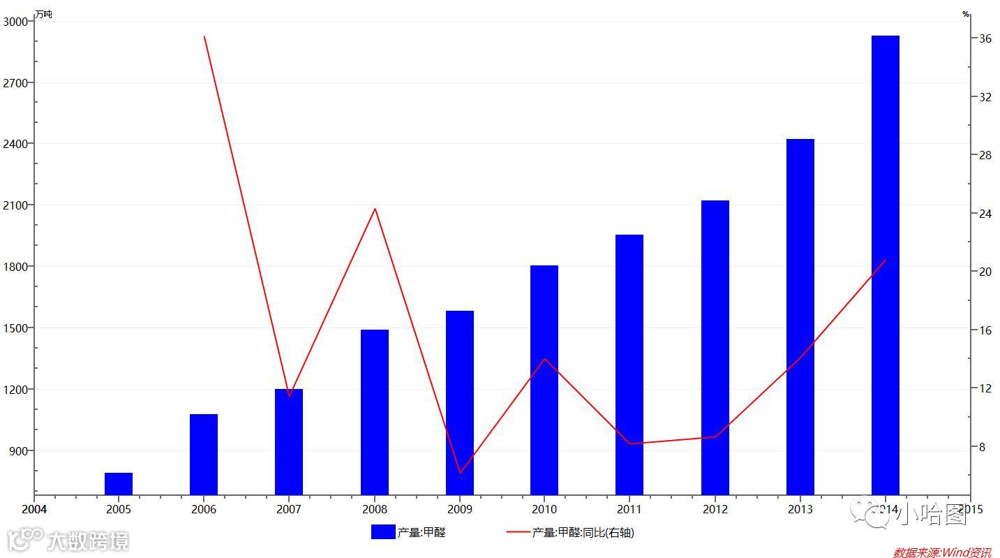另一个下游甲醛在2014年之前尚有不错的增长,然而2015年后则是另一番光景——
