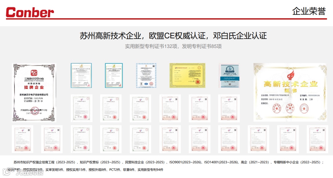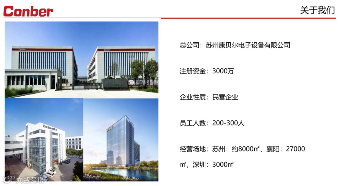 苏州康贝尔电子设备有限公司成立于2010年,总部位于苏州高新区何山路368号长盛科技园,2022年和2024年分别成立“襄阳康贝尔智能装备有限公司”和“康贝尔自动化设备(深圳)有限公司”,是一家集研发、设计、制造、销售及服务于一体的国家级高新技术企业。