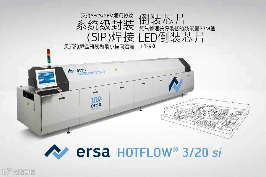埃莎推出全新研发的Hotflow 3/20 si 半导体专用回流炉,能够完全匹配半导体行业的焊接需求。这款Hotflow si 系列的回流炉不但可满足低于20PPM的氮气环境要求,更可做到0.2-3度/秒的冷却斜率,大幅提高设备运作时的稳定性。