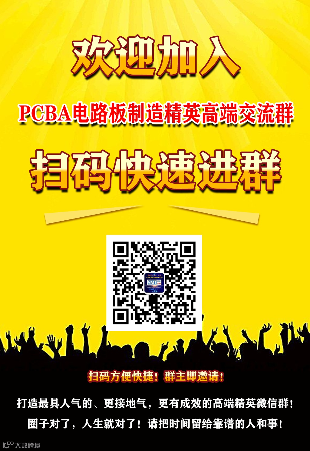 我们SMT头条欢迎你加入我们SMT大家庭,感谢在茫茫网海中我们结缘微信,为了让更多的人产生更多次的连接,我们SMT头条PCBA电路板制造精英高端交流群,让大家相互认识,有机会与SMT与DIP制造大咖互动学习,深度探讨行业未来发展,寻求商务合作。