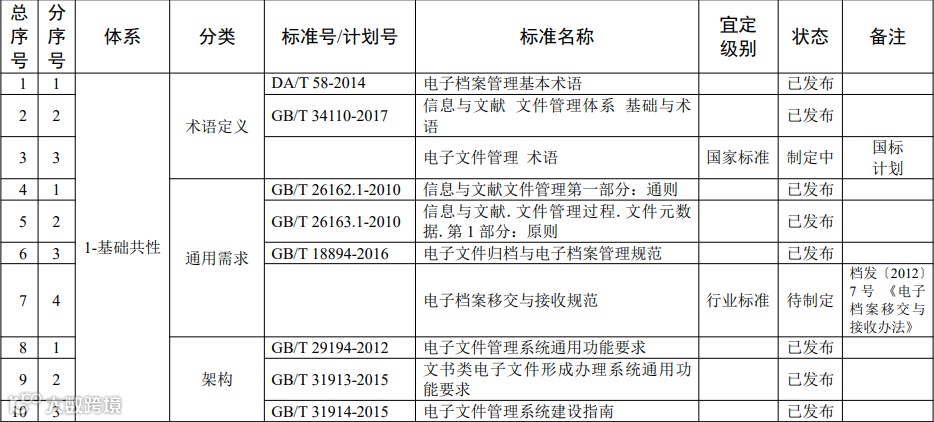 基础共性标准主要规范档案信息化的通用性、指导性标准,包括 术语定义、通用需求、架构、测试与评估、管理等标准。
