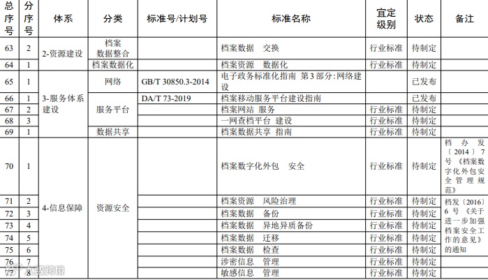 主要规范各类档案信息资源在转换、保存、 利用过程中的安全防护、检测及其它技术要求,包括数字化外包、风 险治理、备份、迁移、检查、涉密及敏感信息等数据安全技术要求和 数据安全管理规范等方面的标准。