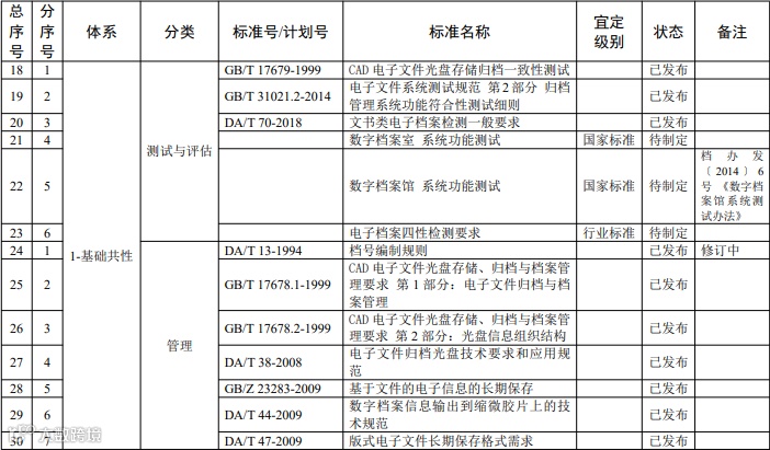 测试与评估标准:主要规范档案信息化相关技术、设备和 系统的测试要求,包括测试方法、评估指标、评估方法等。