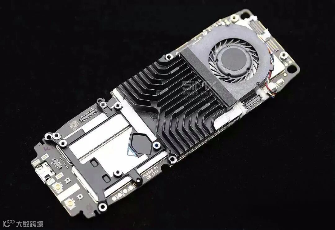 主板正面(已拆掉GPS模块)。布局逻辑清晰:散热鳍片位于主板中部,其形状和走向讲求对称美感,又依电路单元发热轻重而有量身定制的设计,可谓巧妙至极。散热片主体下方为主要发热单元,导流槽将风扇产生的气流带出位于机身顶盖两侧的散热孔,次要发热单元也因散热片的整体延伸和风扇的介入而获得有效的热交换。