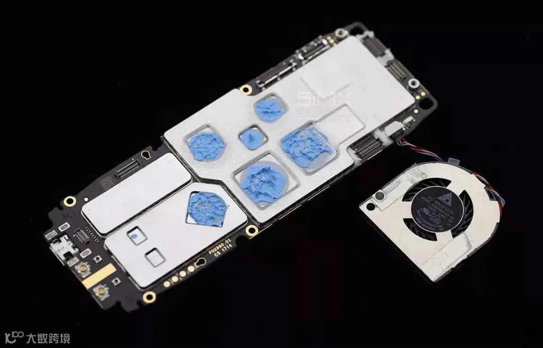 拆掉风扇和散热器,可见发热点均有导热硅脂传导(蓝色物质)。又为取得良好的电磁屏蔽效果,电路板上的所有零件均被电磁屏蔽罩按单元功能划分进行电磁屏蔽处理。