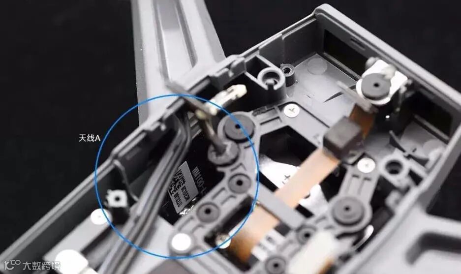 Spark的天线跑的是2.4G信号,共有两根天线,分别位于机身前部的左右两侧。上图展示的是位于左侧的天线。