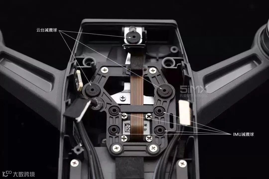 Spark的云台相机采用了3颗减震球;Spark的IMU是一个独立的模块,被安放在云台后部的机身里,被4颗减震球悬挂起来。这一设计可以保证IMU免受电磁干扰,同时拥有独立的减震装置,使其工作更加稳定可靠。