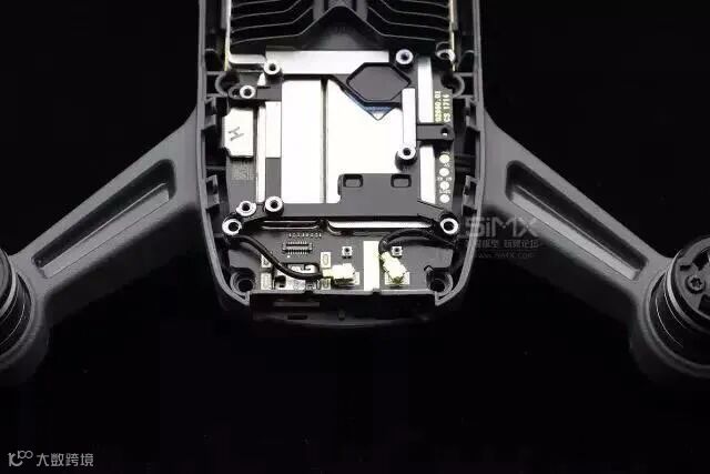 这个部分的右侧应该为Spark的高频通讯模块。两条馈线连接着天线,而天线的位置侧在机身头部侧面。