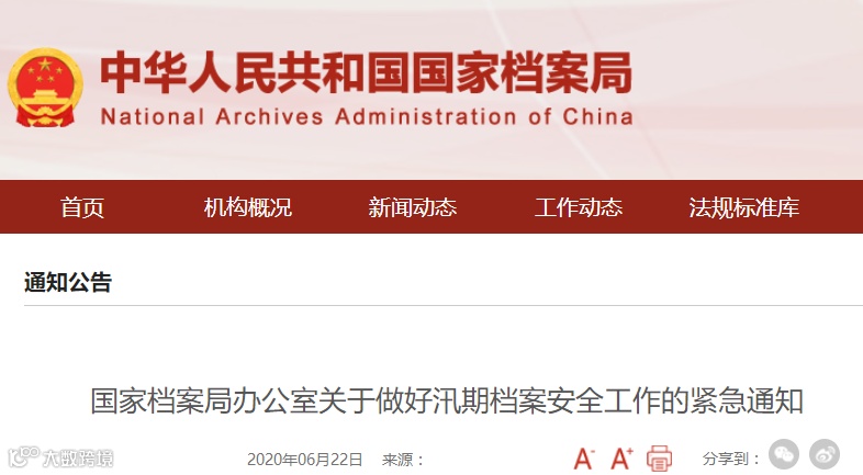 6月份以来,我国南方地区发生持续强降雨,降雨过程强度大、影响范围广、持续时间长,数条河流发生超警戒水位以上洪水。根据国家防总通报,今年夏季我国气候状况总体偏差,极端天气气候事件偏多,防汛形势复杂严峻,不容乐观。针对此情况,国家防总近期已启动防汛Ⅳ级应急响应。各级档案部门要认真贯彻落实国家档案局《关于进一步加强档案安全工作的意见》,高度重视汛期档案安全工作,采取必要措施,确保档案绝对安全。现就有关事项通知如下: